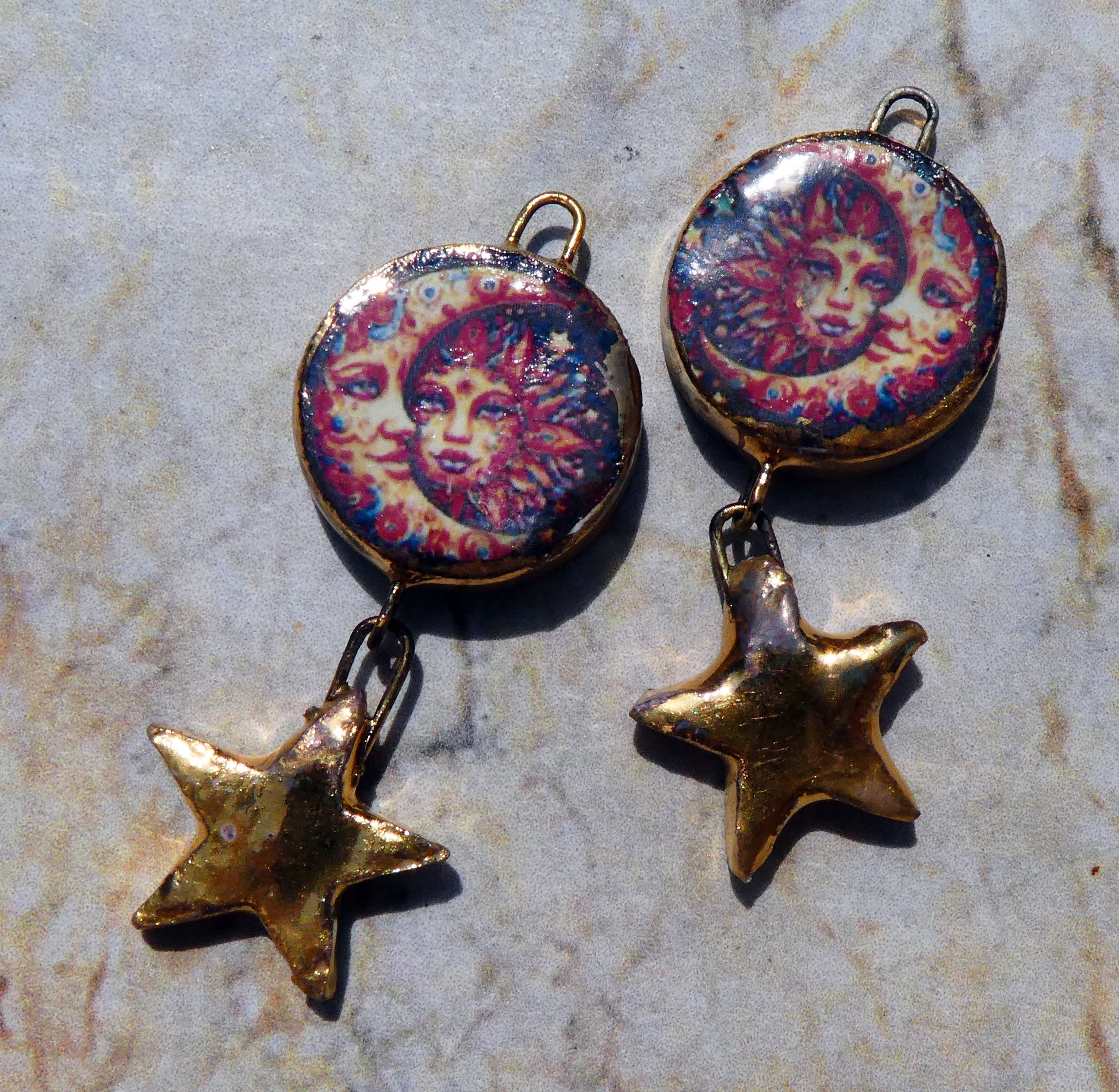 Ceramic Vintage Sun and Moon Decal and Star Earring Dangles #6