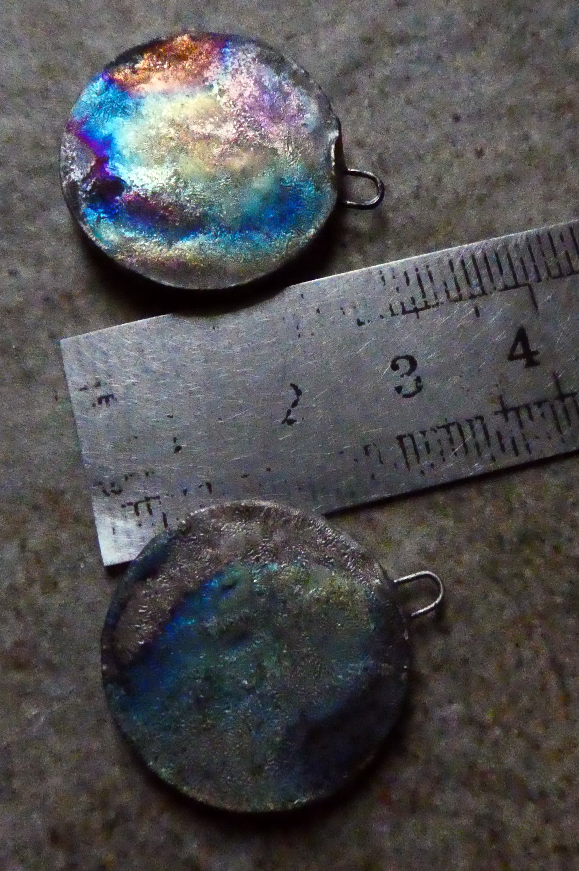 Hand formed in Earthstone, and high fired. Then fired again with bronze clay and Gloss glaze. Applied with decals and fired again. Applied with Platinum lustre, and fired once more. Scorched on the backs to a coppery rainbow finish.
