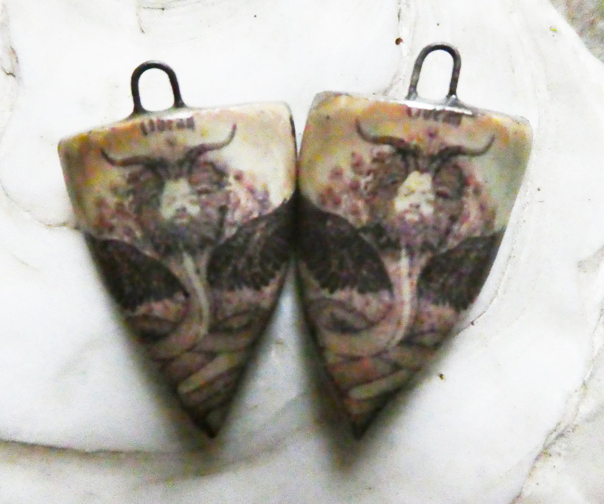Hand formed in Earthstone, and high fired. Then fired again with bronze clay and Gloss glaze. Applied with decals and fired again. Applied with Platinum lustre, and fired once more. Scorched on the backs to a coppery rainbow finish.