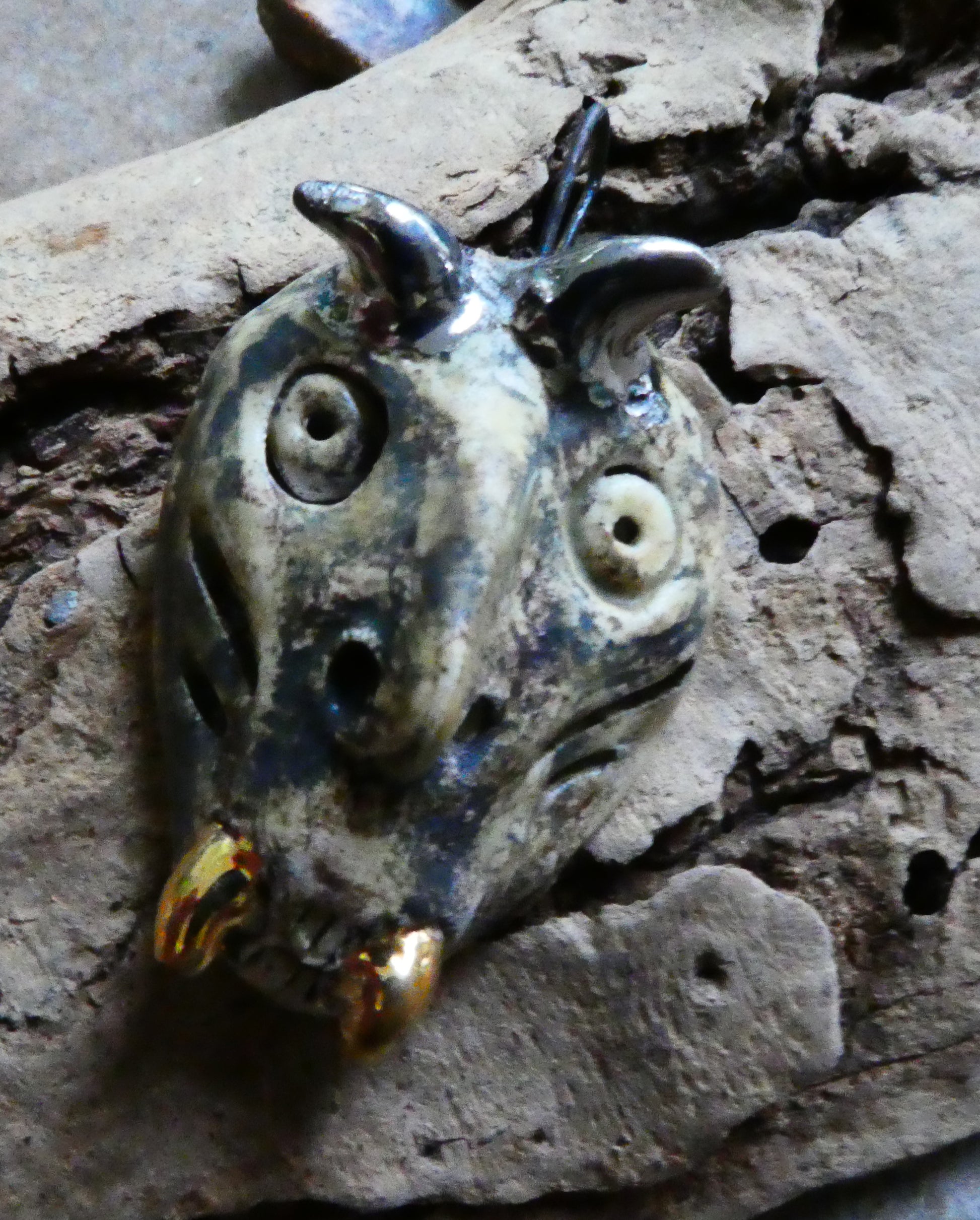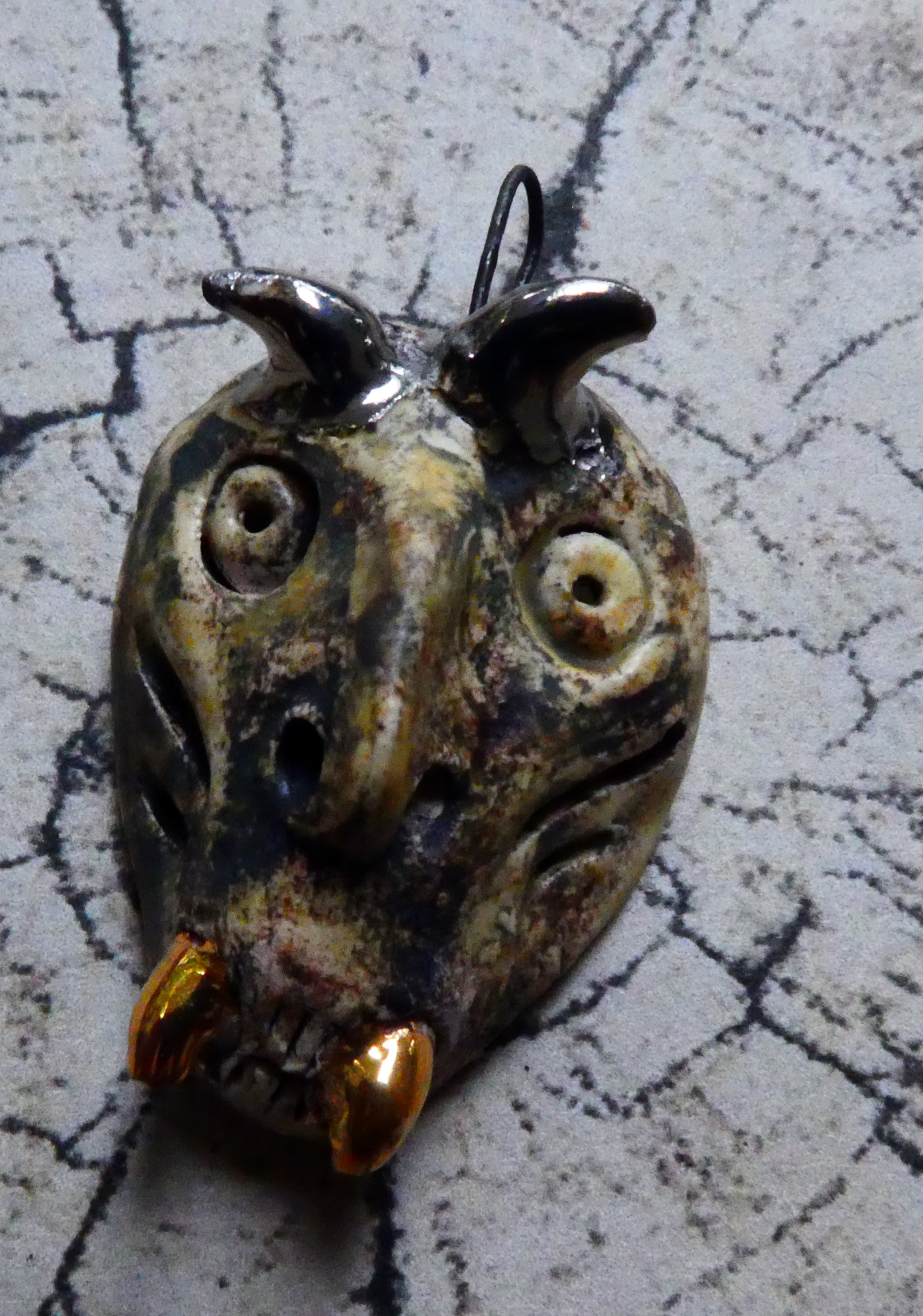 Hand sculpted in Earthstone and wire staples, and high fired. Then fired again with oxide and matte glaze.