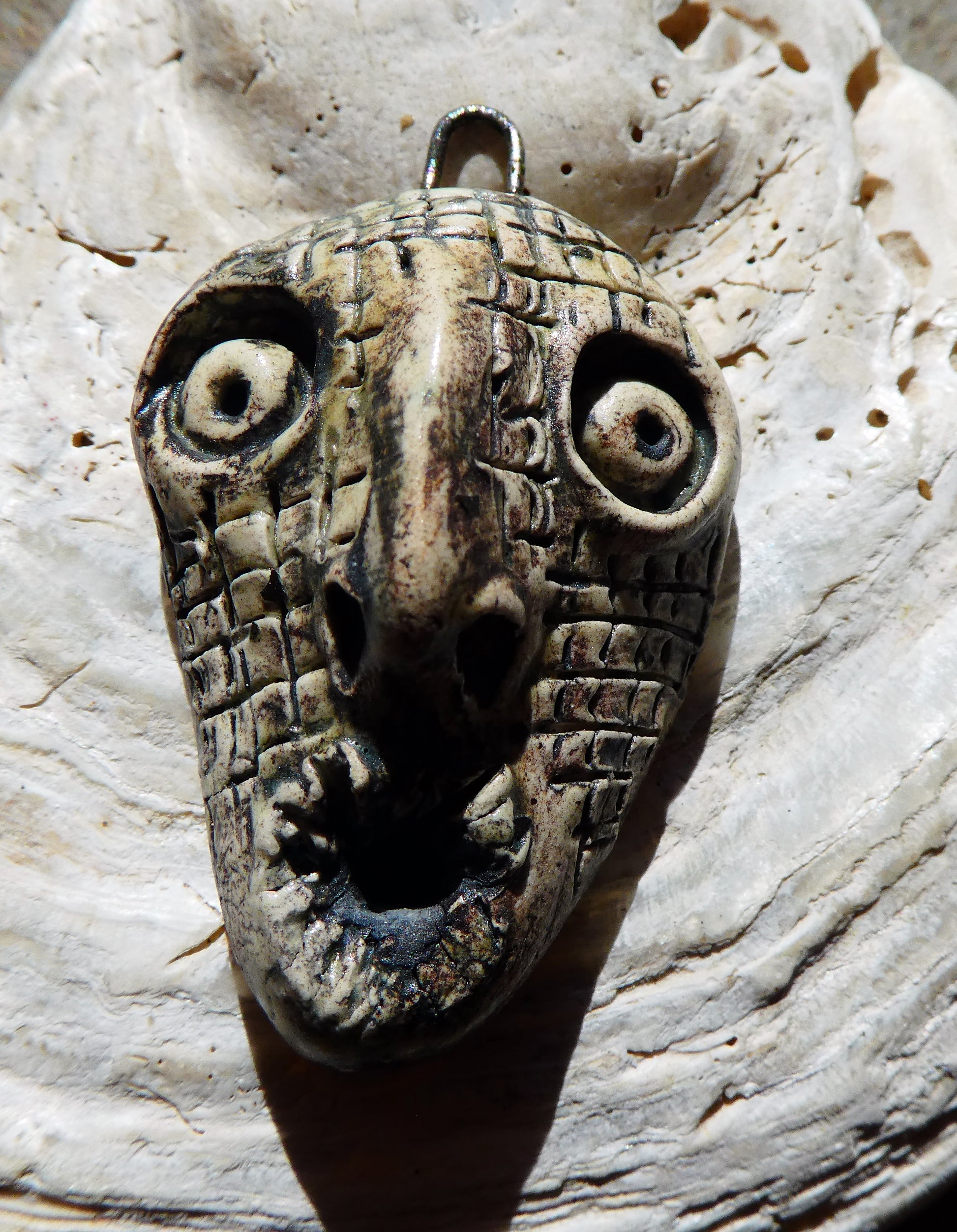 Hand sculpted in Earthstone and wire staples, and high fired. Then fired again with oxide and matte glaze.