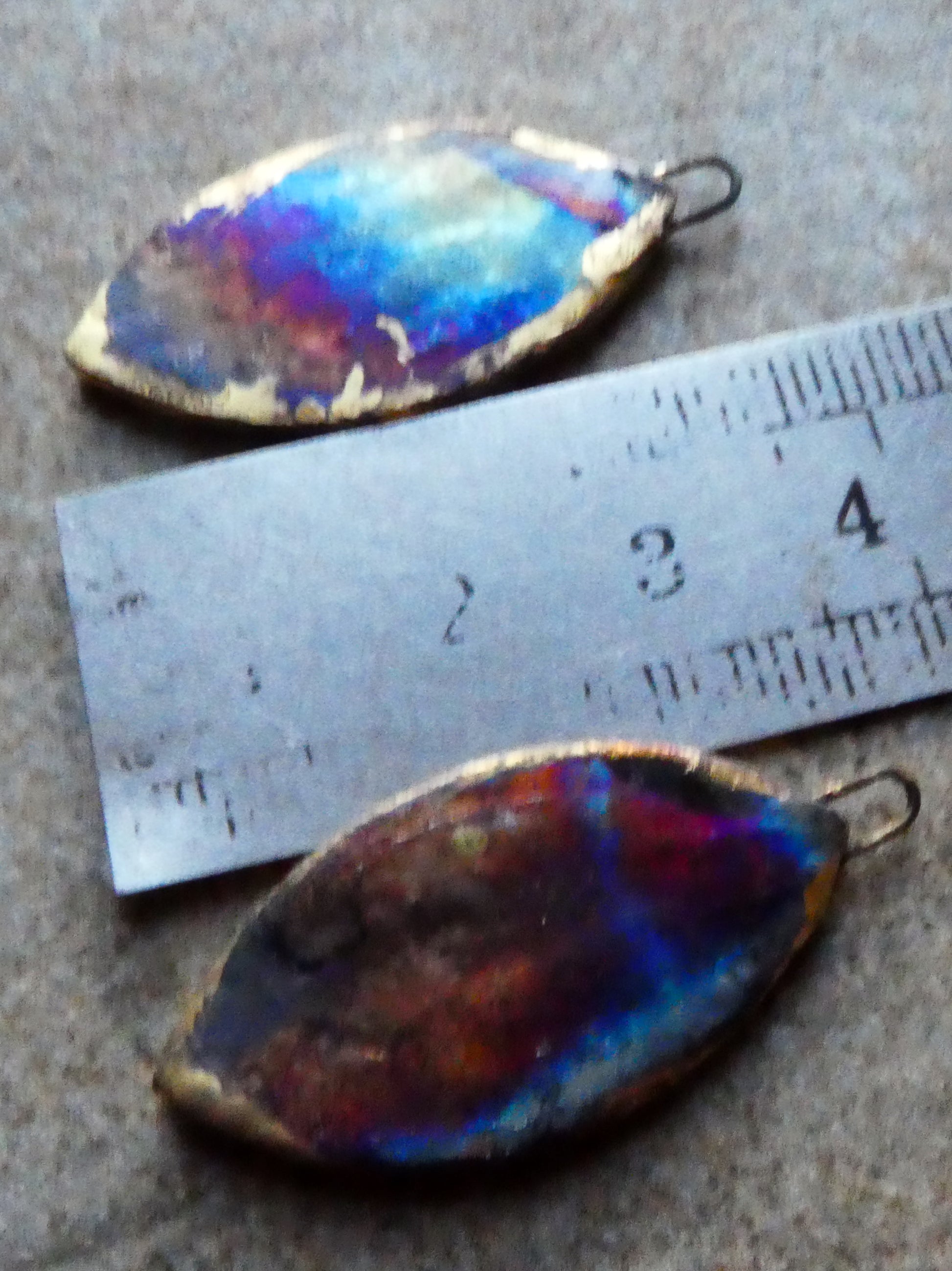 Hand formed drops, fired with gloss glaze and Bronze clay. Then applied with decals and fired again. Applied with lustre and fired once more. Scorched to a rainbow finish on the backs.
