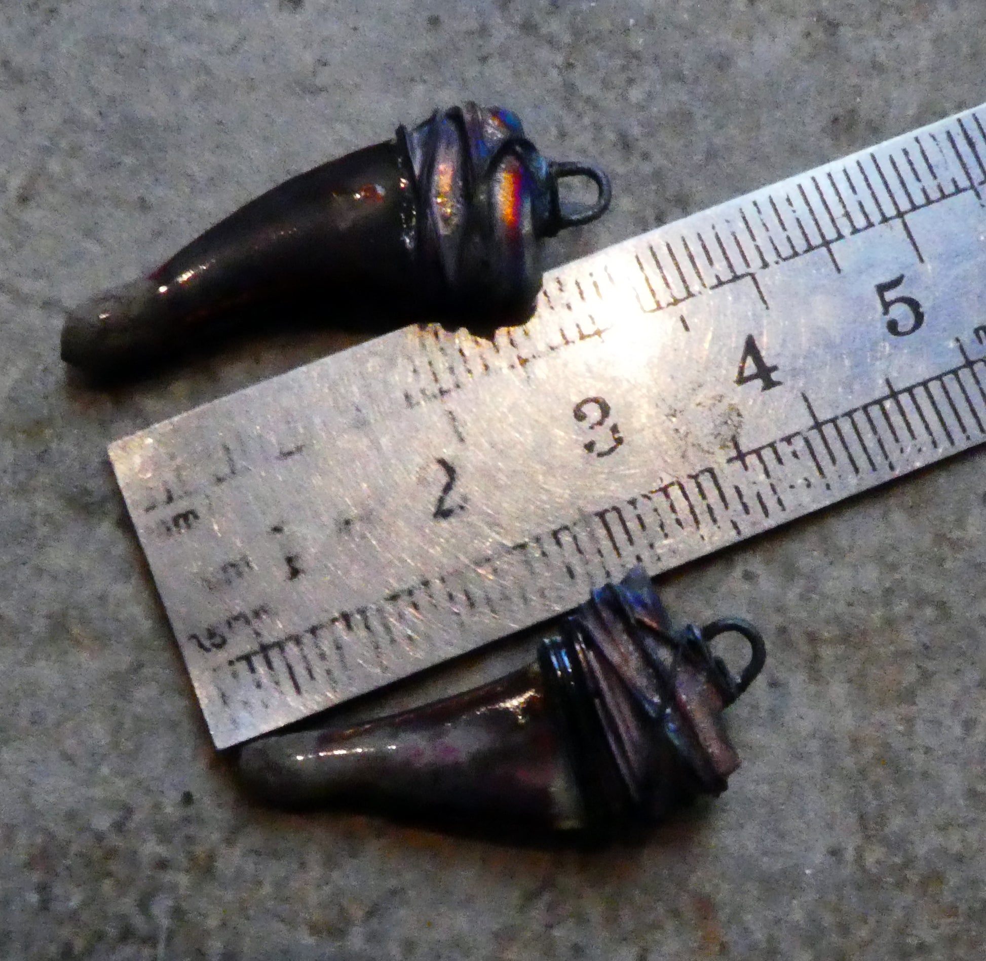 Hand formed in Earthstone and high fired with wrapped wire. Fired again with Bronze clay and Volcanic Glow glaze. Scorched on the tops to a rainbow finish.