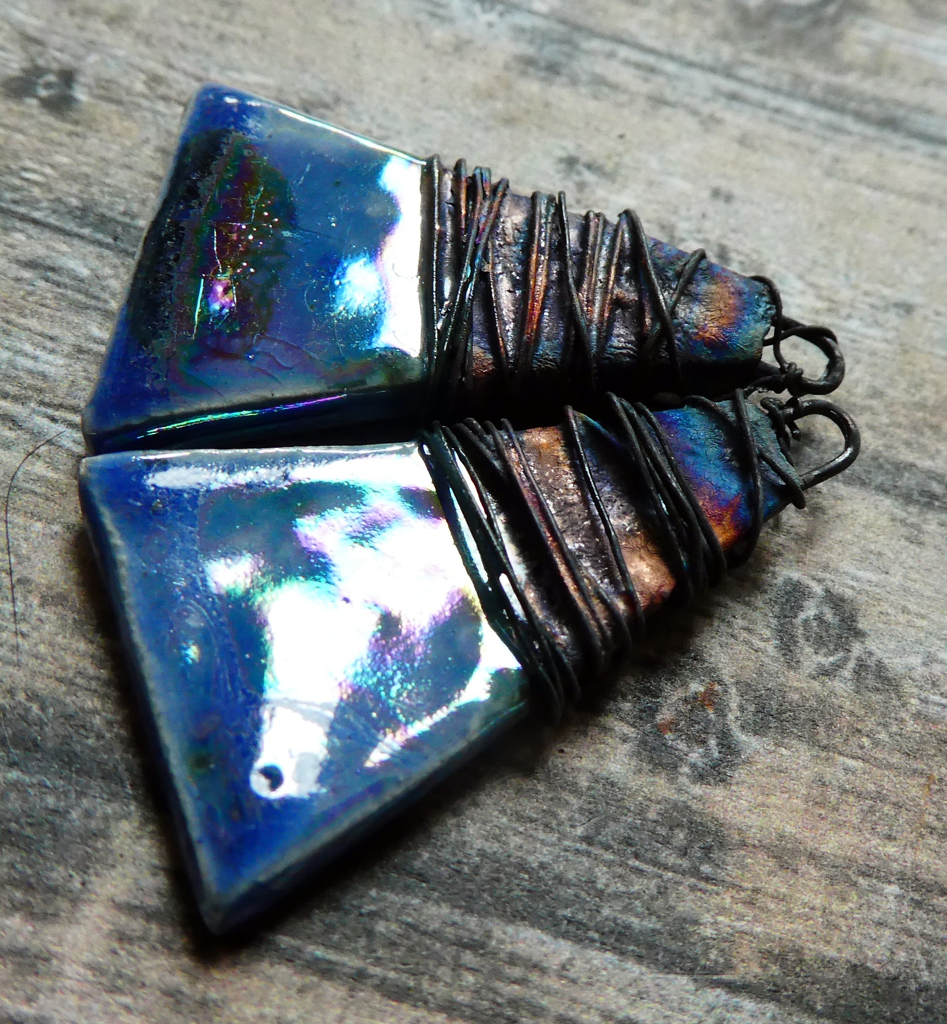 Hand formed in Earthstone and high fired with wrapped wire. Fired again with Bronze clay and Soft Blue glaze. Applied with Mother of Pearl lustre, and fired once more. Scorched on the tops to a rainbow finish.
