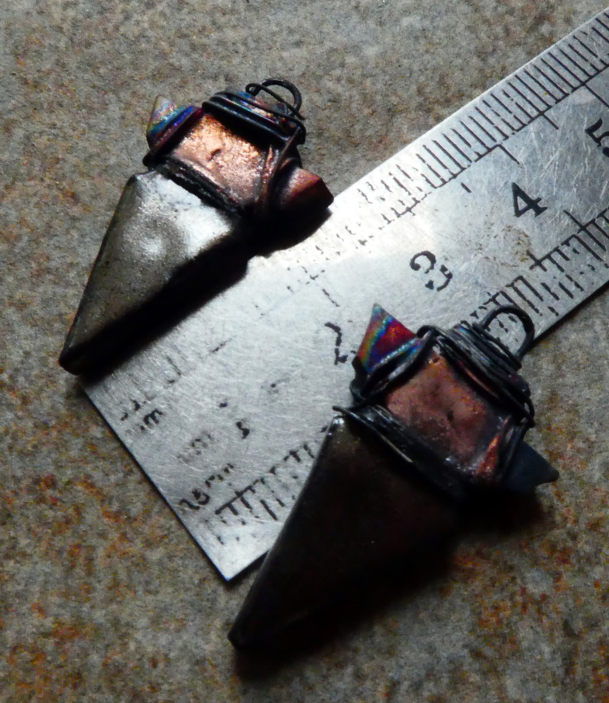 A pair of wire wrapped spearhead earring charms on hoops.