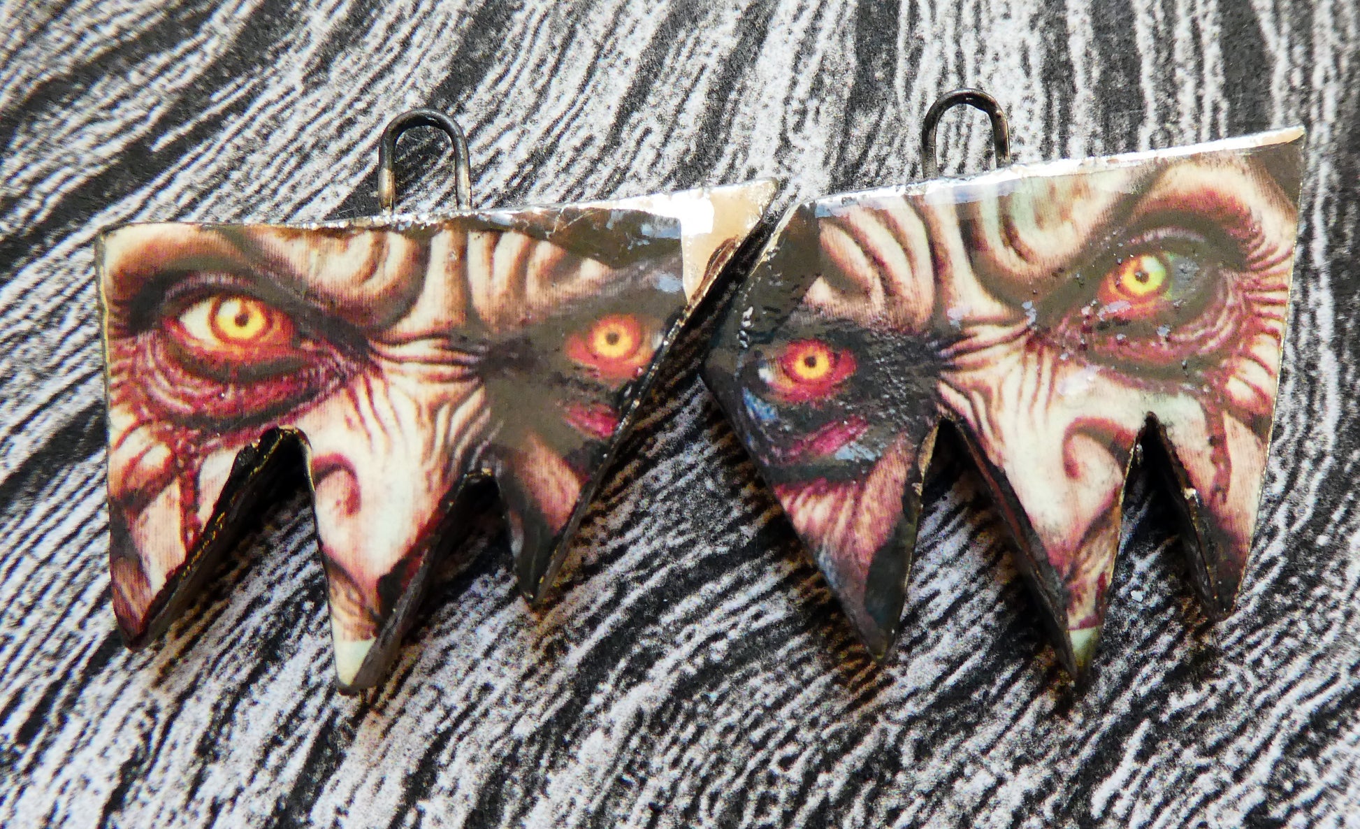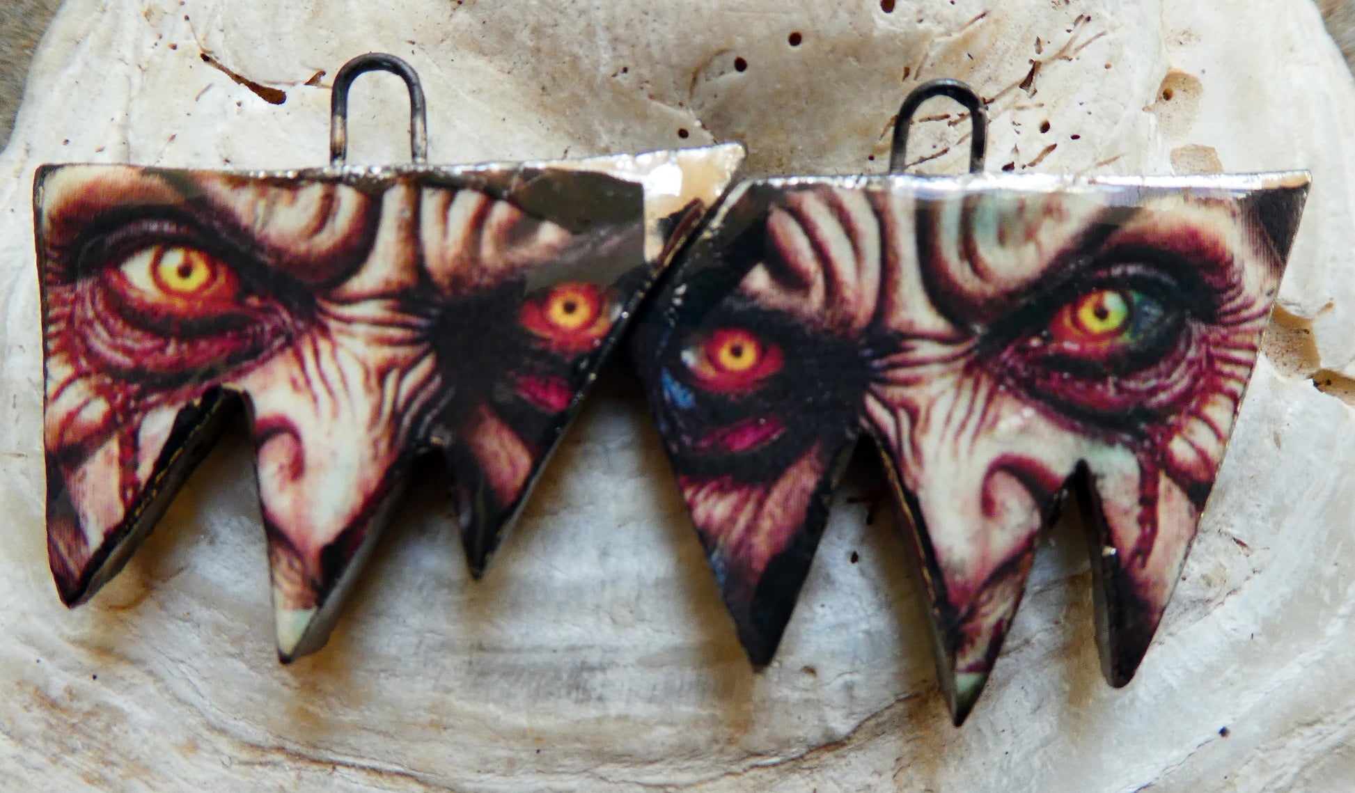 A pair of lightweight droppers. Hand formed, asymmetric, torn curtain shapes in Earthstone . High fired, then fired again with glossy glaze. Then applied with Witch decals and fired again with lustre. 25mms, and very lightweight. ©ScorchedEarthDesigns