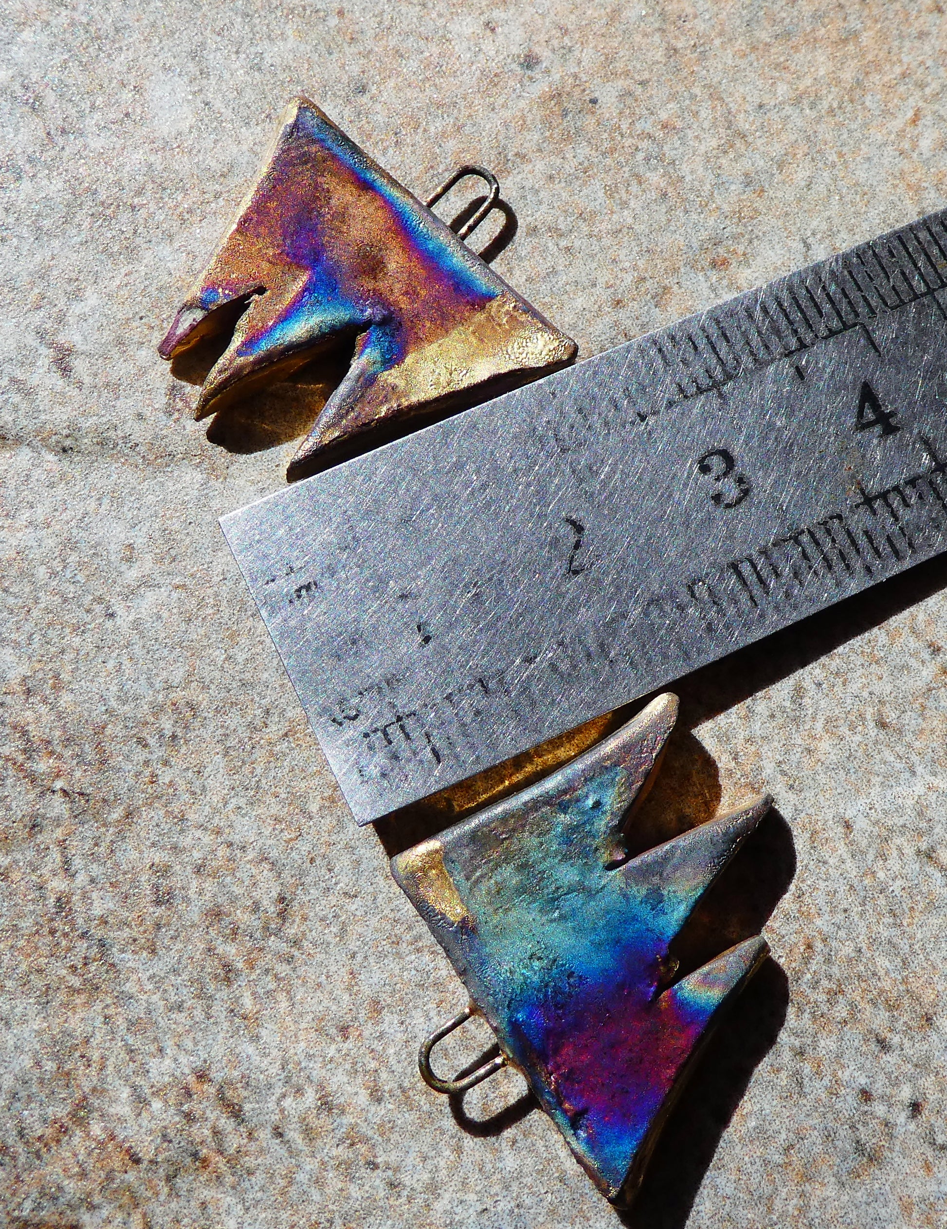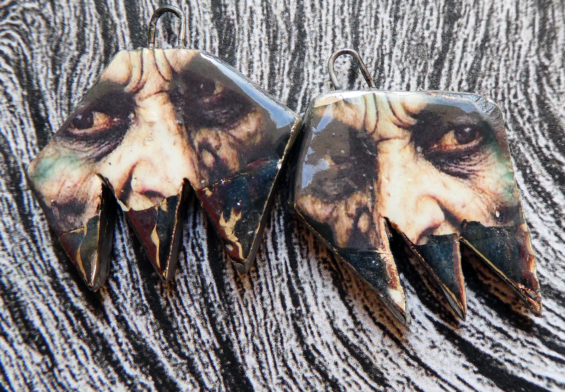 A pair of lightweight droppers. Hand formed, asymmetric, torn curtain shapes in Earthstone . High fired, then fired again with glossy glaze. Then applied with Witch decals and fired again with lustre. 25mms, and very lightweight. ©ScorchedEarthDesigns