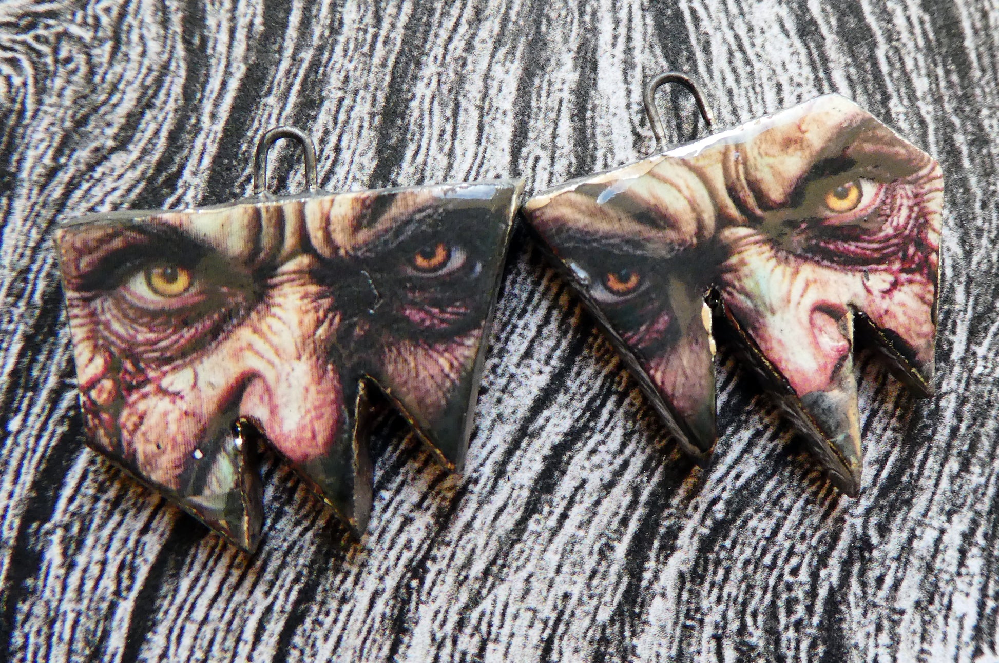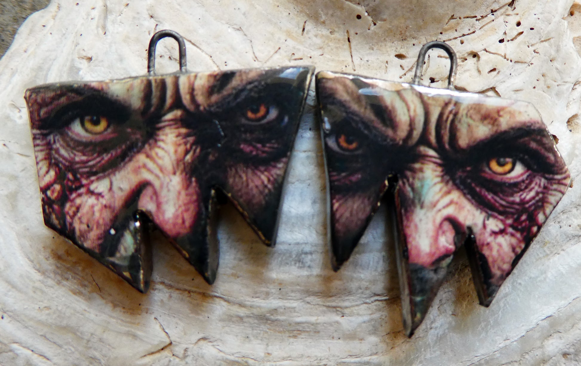 A pair of lightweight droppers. Hand formed, asymmetric, torn curtain shapes in Earthstone . High fired, then fired again with glossy glaze. Then applied with Witch decals and fired again with lustre. 25mms, and very lightweight. ©ScorchedEarthDesigns