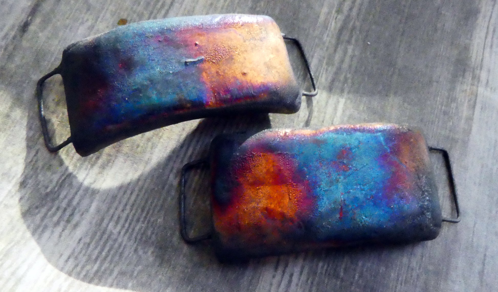 High fired, then fired again with my own Bronze clay.Scorched to a rainbow finish.
