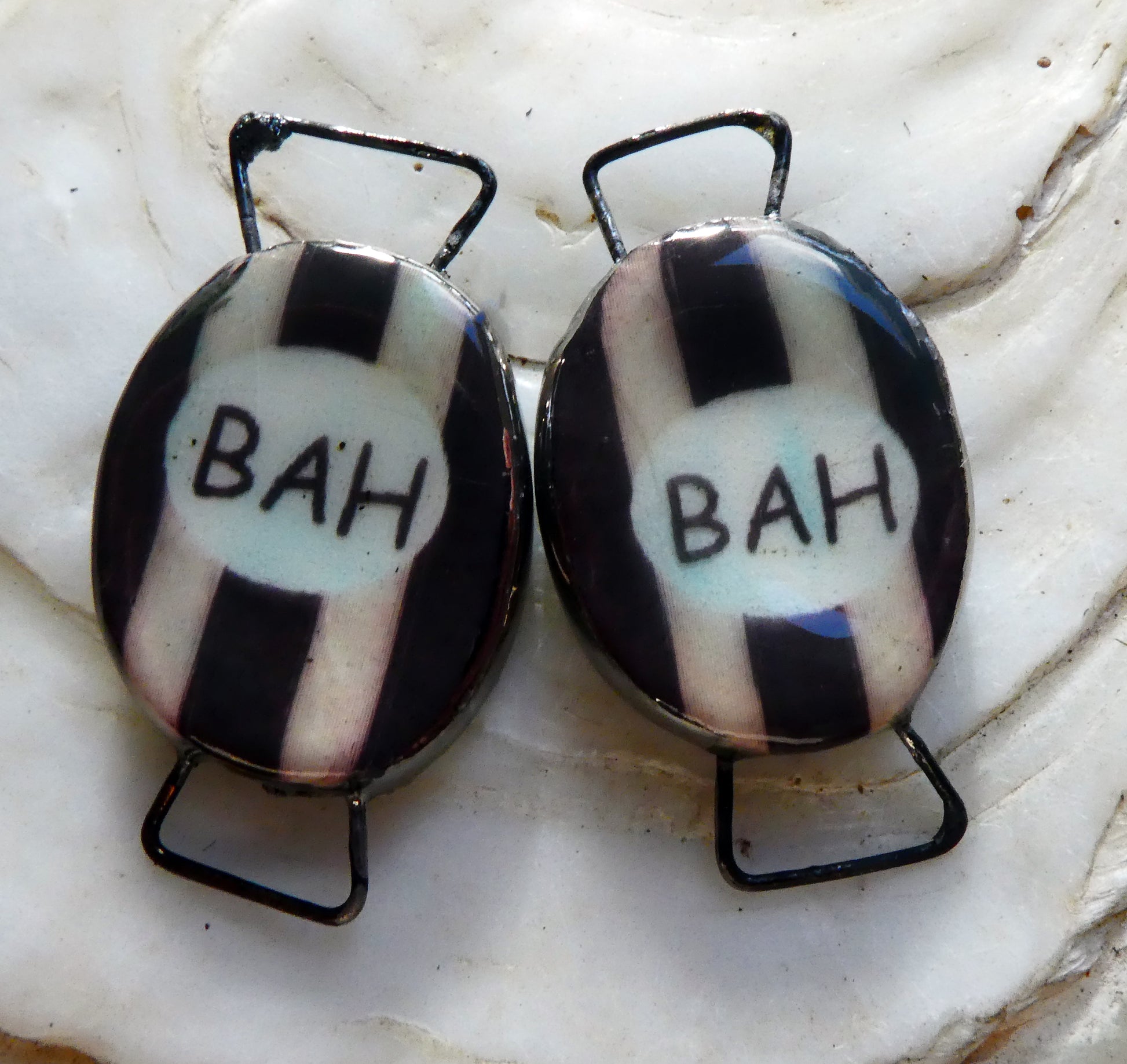 Hand formed in Earthstone and high fired. Then fired again with Bronze clay and Gloss glaze. Fired again with humbug decals, and then once more with Platinum Lustre. Scorched on the backs to a rainbow finish.