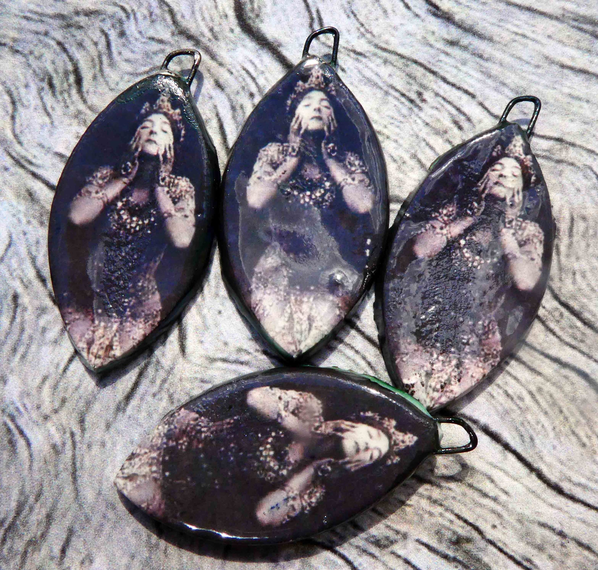 Hand formed in Earthstone and high fired. Then fired again with bronze clay and gloss glaze. Applied with decals and Platinum lustre and fired again. Scorched on the backs to a rainbow finish. 40mms and very lightweight.