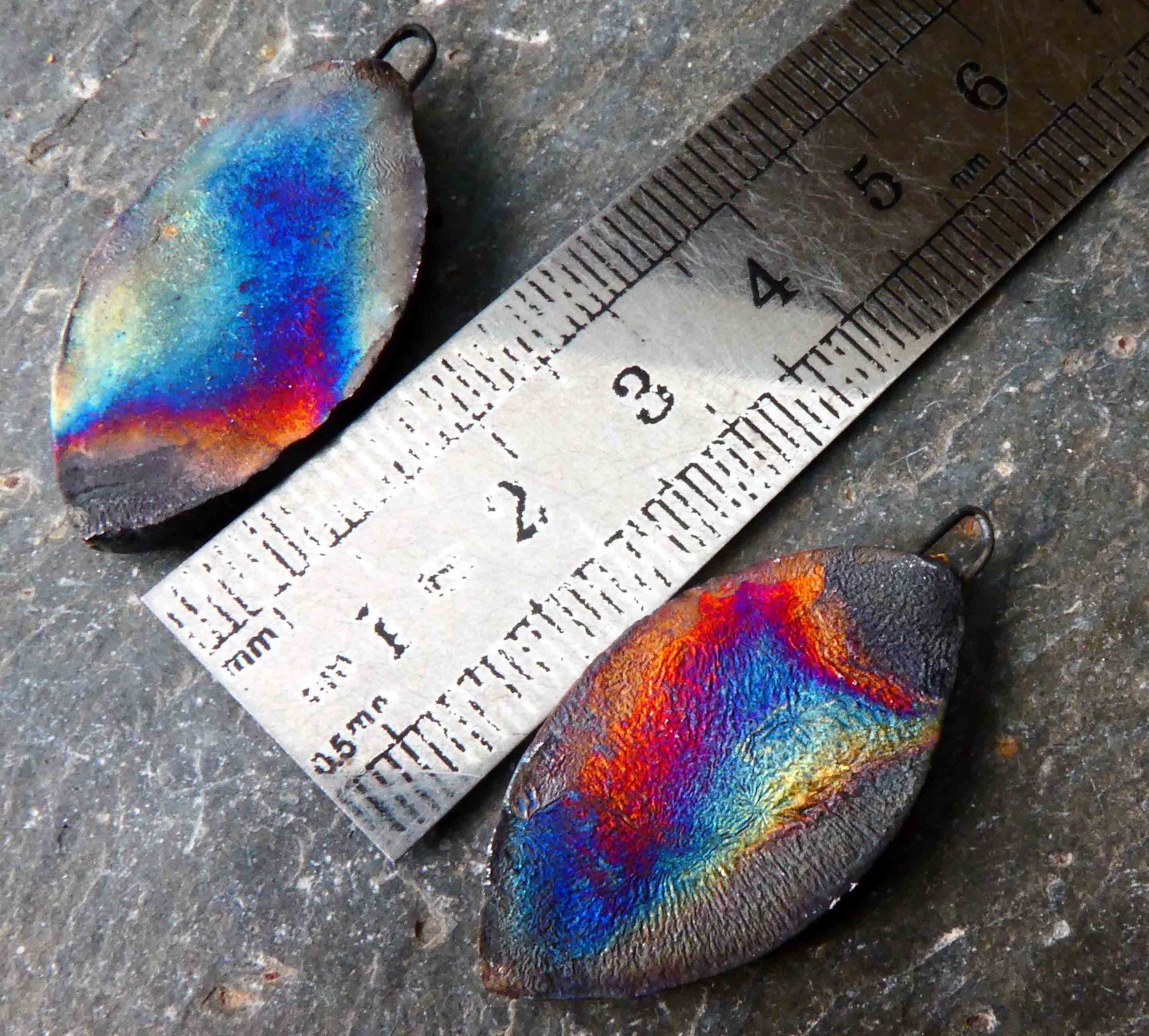 Hand formed in Earthstone and high fired. Then fired again with bronze clay and gloss glaze. Applied with decals and Platinum lustre and fired again. Scorched on the backs to a rainbow finish. 40mms and very lightweight.