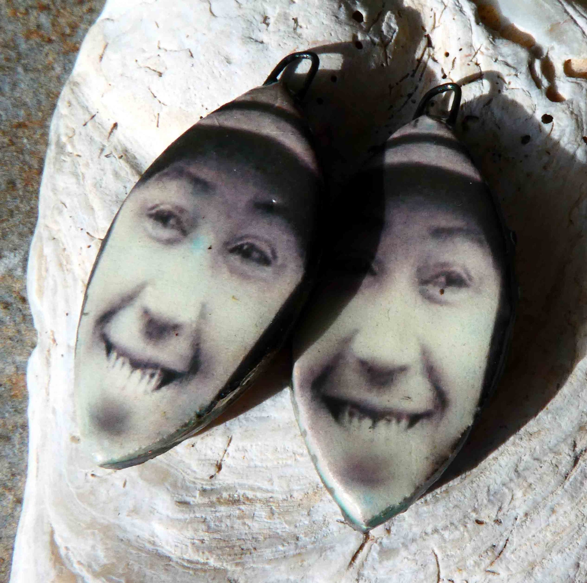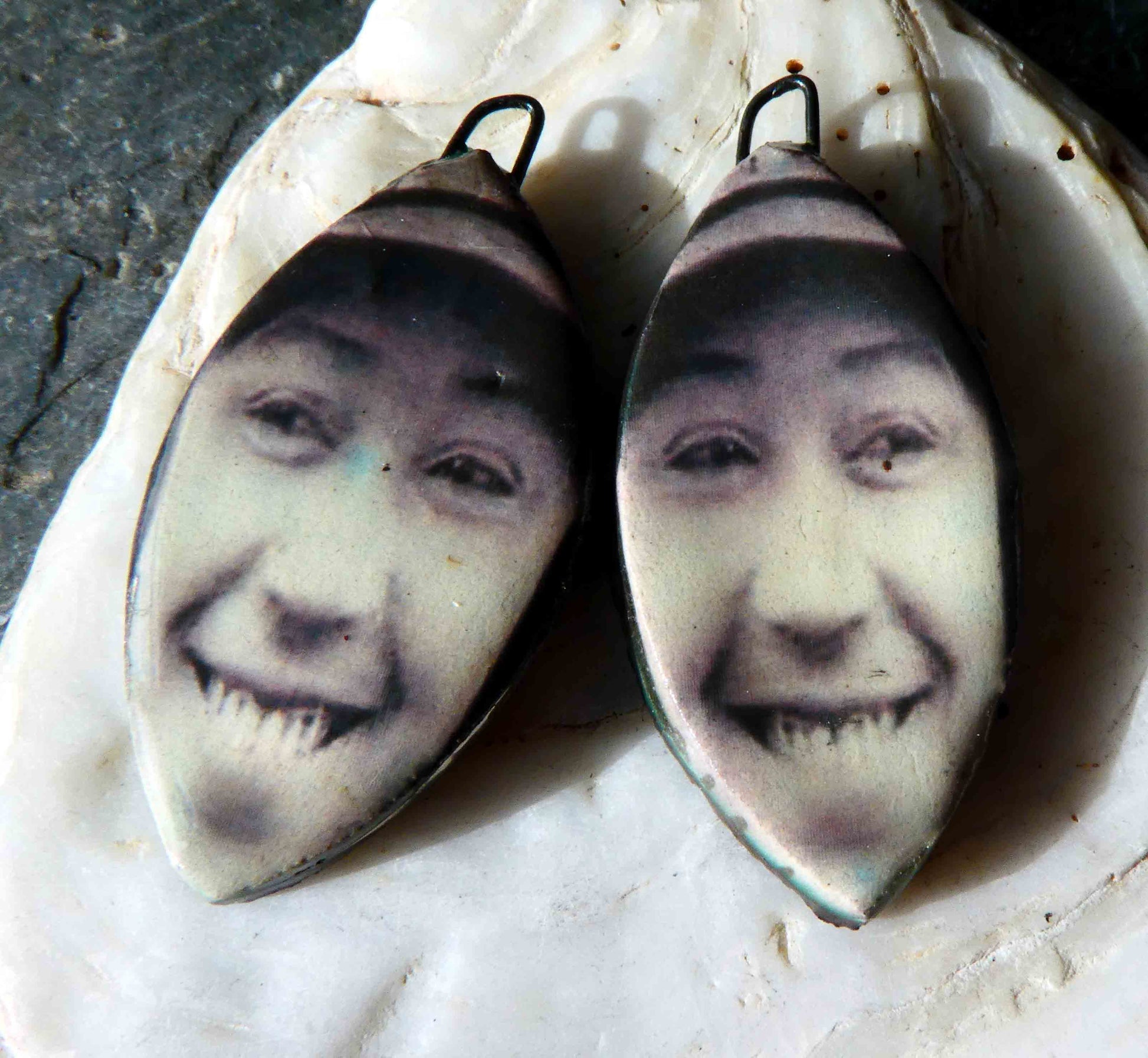 Hand formed in Earthstone and high fired. Then fired again with bronze clay and gloss glaze. Applied with decals and Platinum lustre and fired again. Scorched on the backs to a rainbow finish. 40mms and very lightweight.