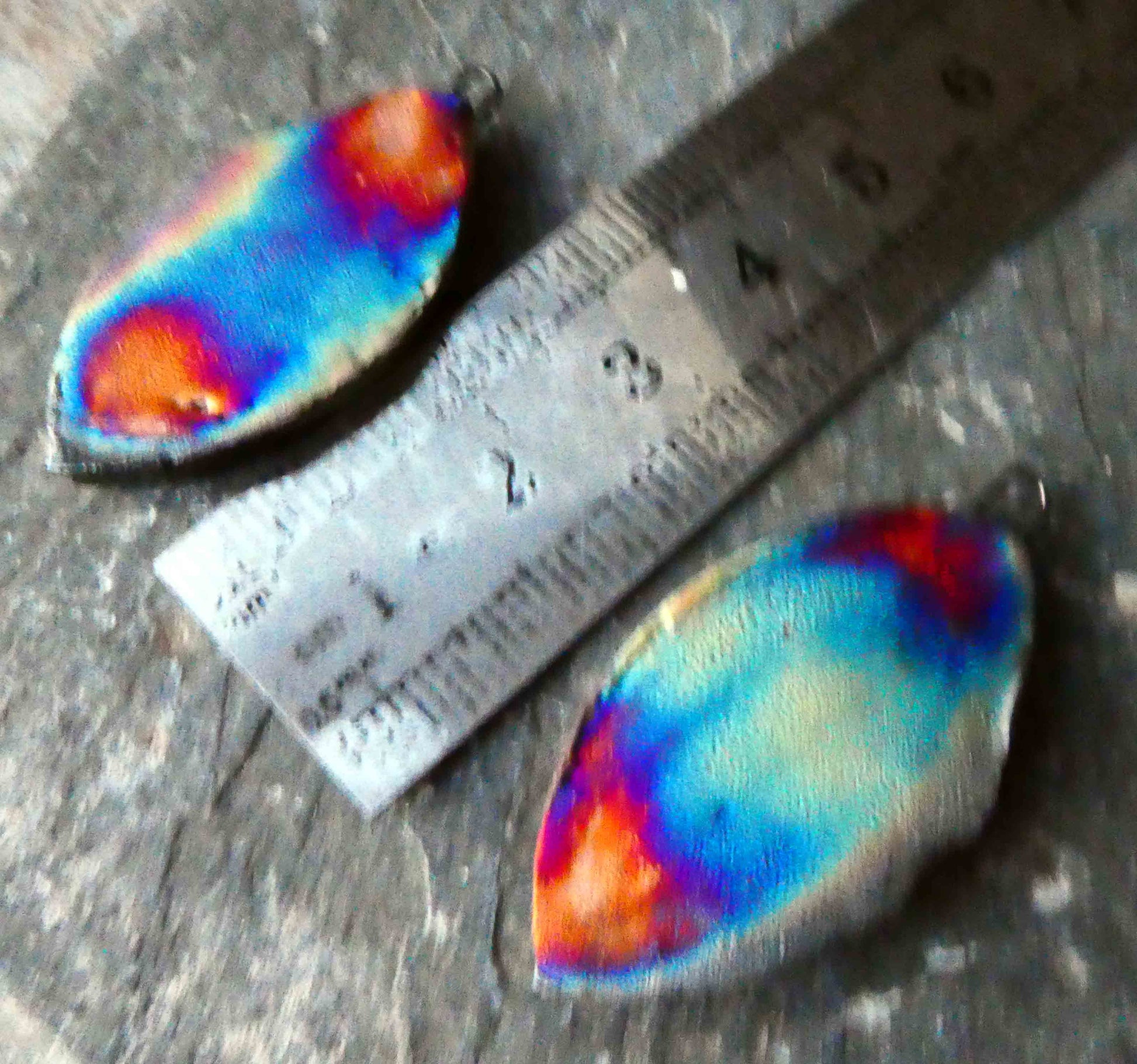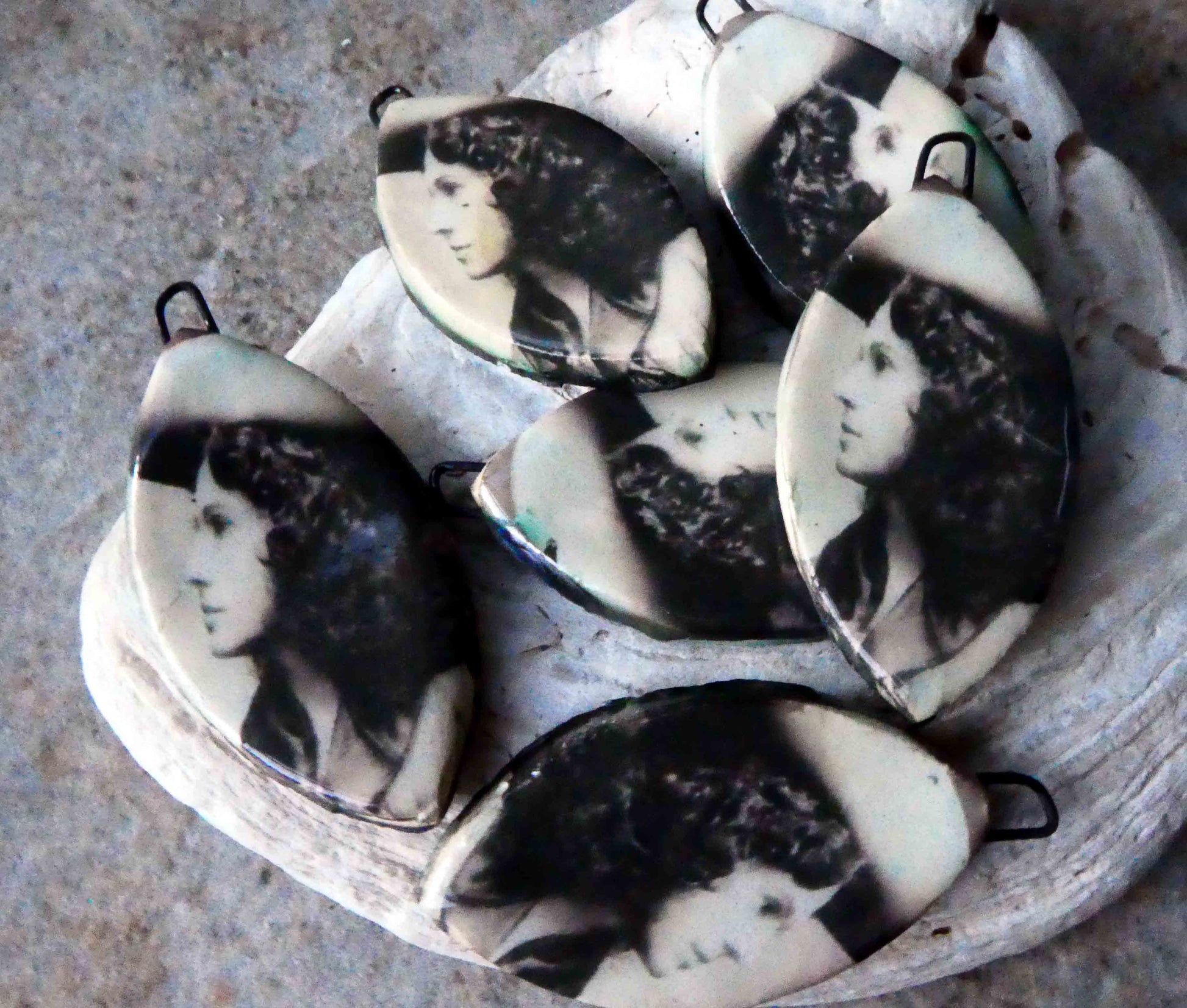 Hand formed in Earthstone and high fired. Then fired again with bronze clay and gloss glaze. Applied with decals and Platinum lustre and fired again. Scorched on the backs to a rainbow finish. 40mms and very lightweight.