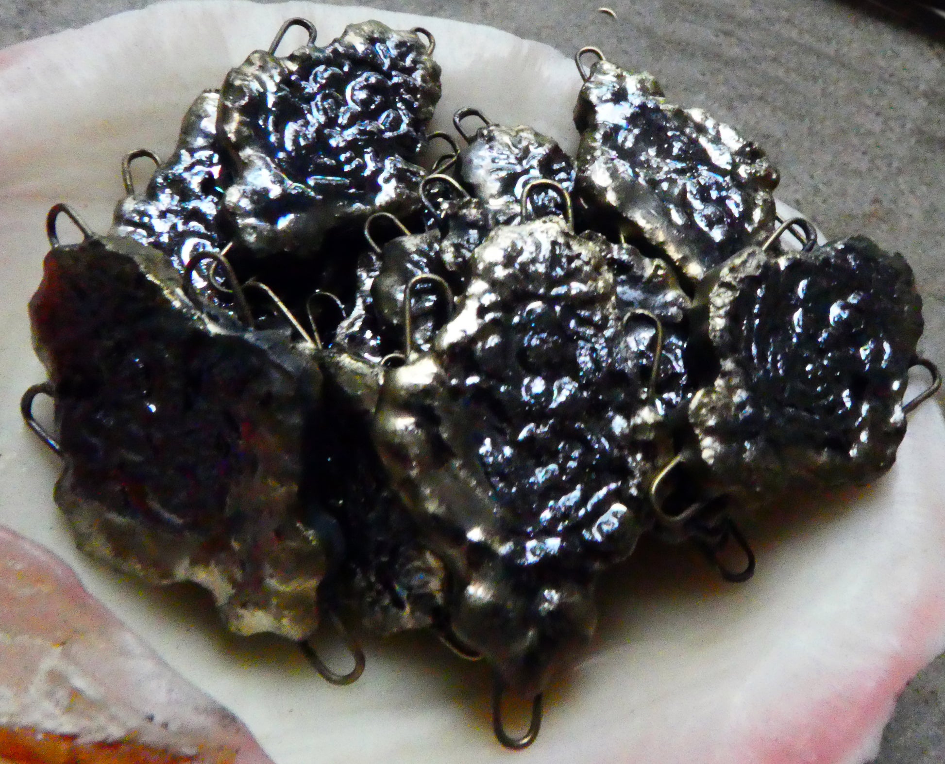 Hand formed in Black Stoneware and high fired. Then fired again with Crackle glaze and Bronze clay. Applied with Mother of Pearl Lustre, and fired once more.