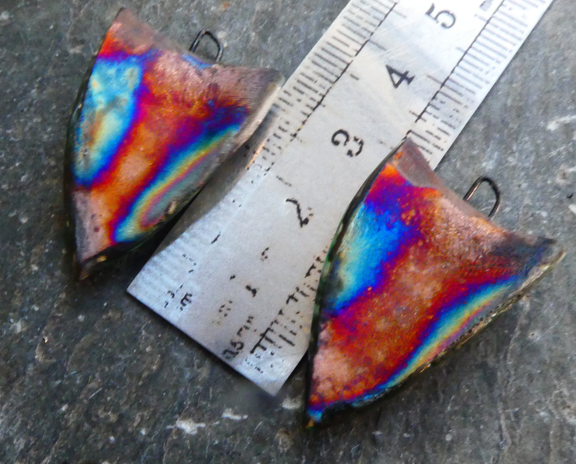 Hand formed drops, fired with gloss glaze and Bronze clay. Then applied with Spook ceramic decals and fired again with Lustre. Then scorched on the backs to a rainbow finish.