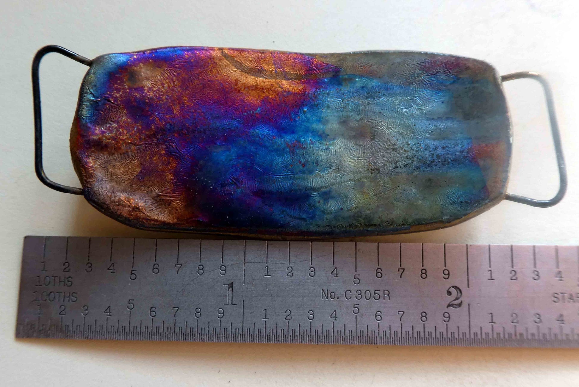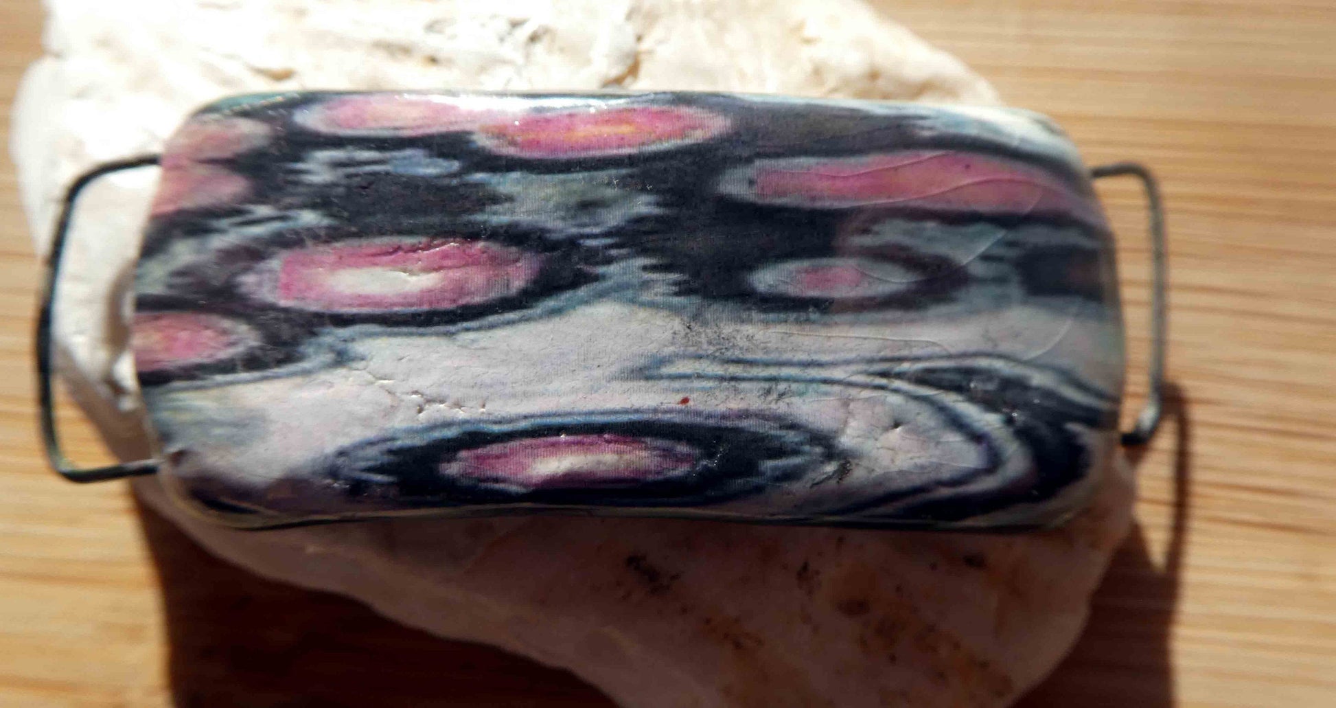 A gemstone decal bracelet focal. A hand formed bracelet bar in Earthstone, with a hoop on either side. High fired, then fired again with gloss glaze and Bronze clay. Applied with a gemstone decal and fired again with Platinum Lustre. Curved to fit a wrist. Scorched on the back to a rainbow finish. ©ScorchedEarthDesigns