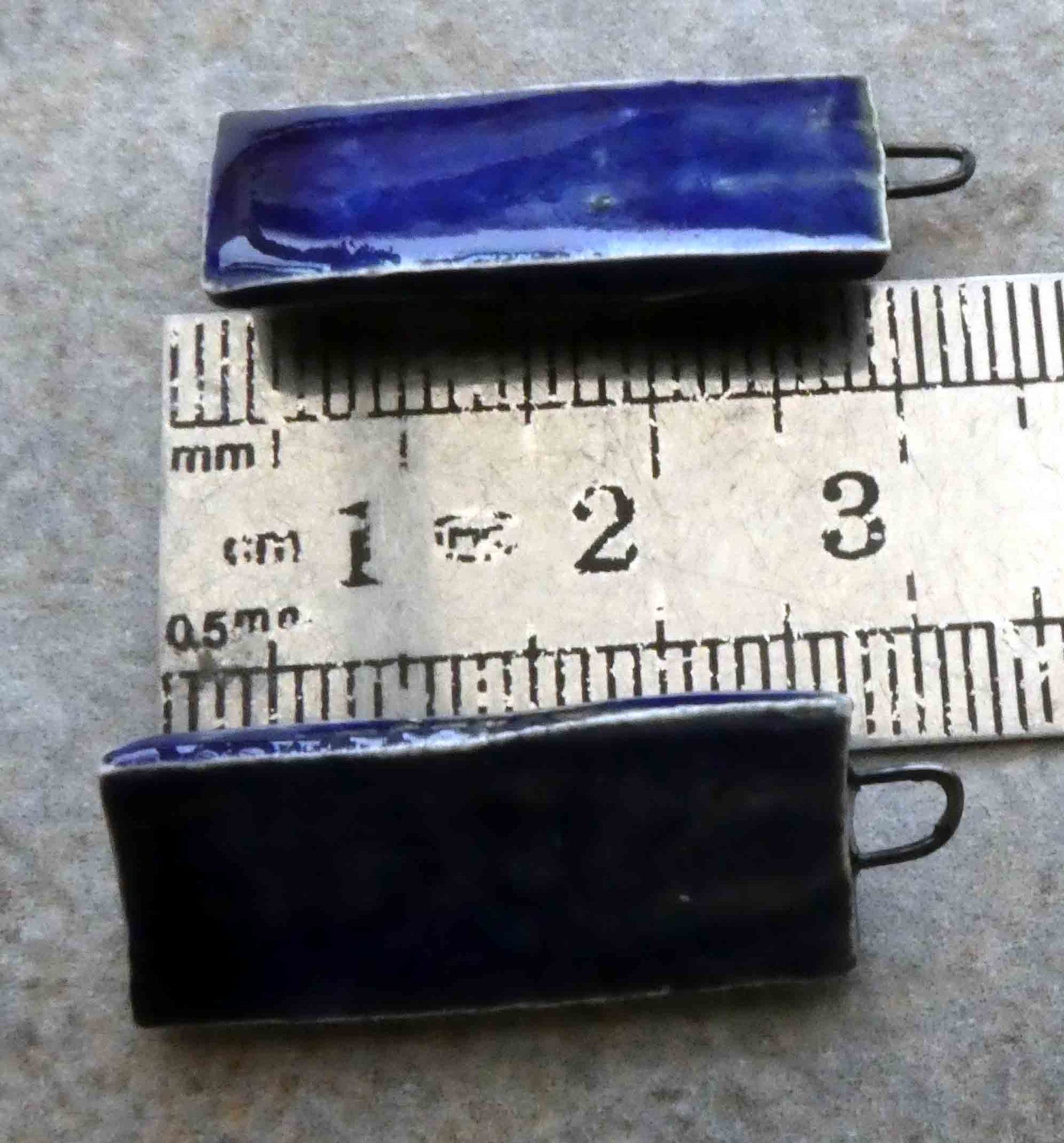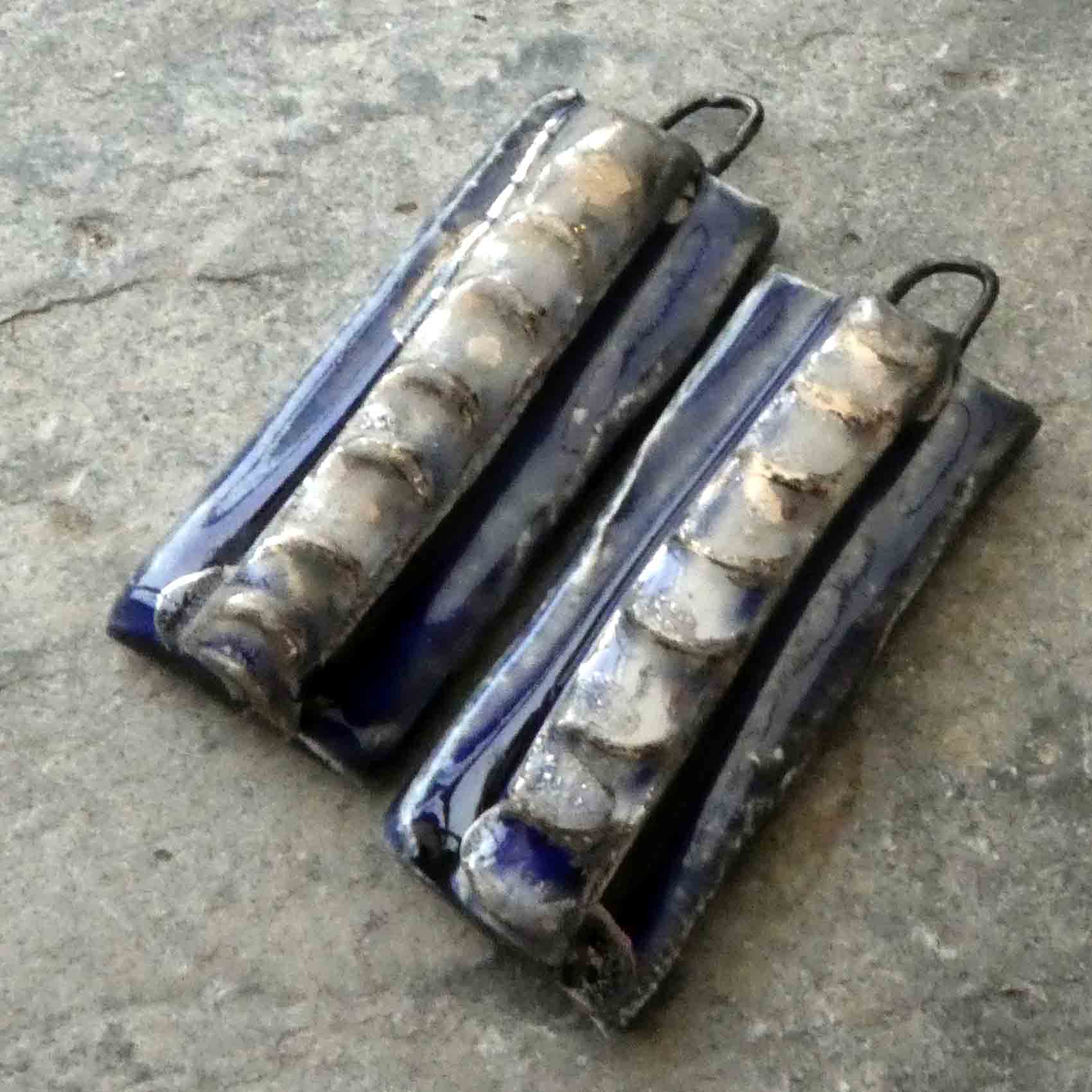 Hand formed in Earthstone with a moulded strip in the centre. High fired. Then fired with Mirror Blue and gloss glaze. Then applied with Platinum Lustre and fired again.