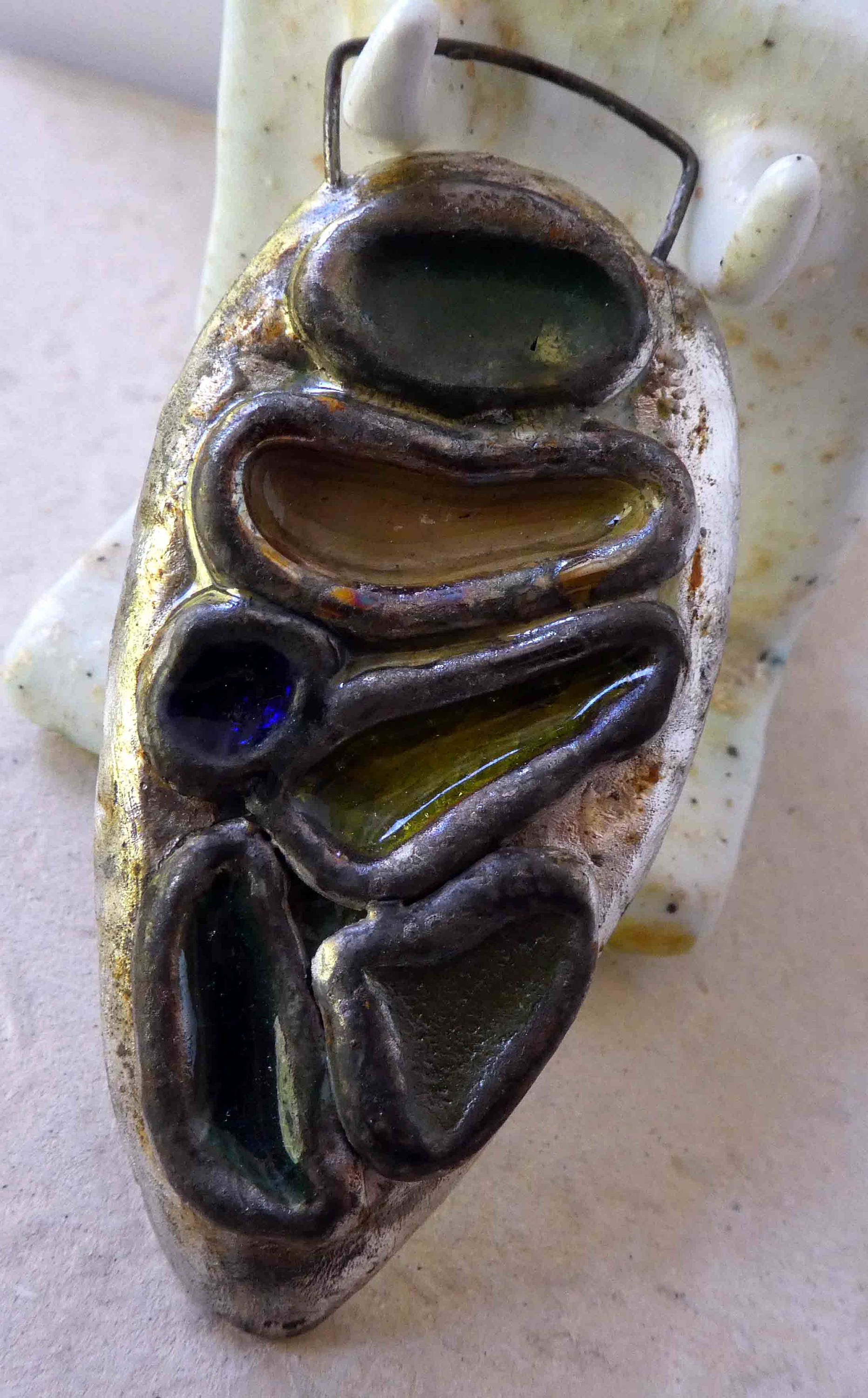 A pendant of lustrous pools. Hand sculpted pendant in Porcelain. A flat base, with raised pools on top. High fired. Then fired again with .999 fine silver, and brushed to a shine. I then filled the pools with different enamels, and overfired it. As a result, the enamels have taken on an aged, and lustrous finish. Nice weight.