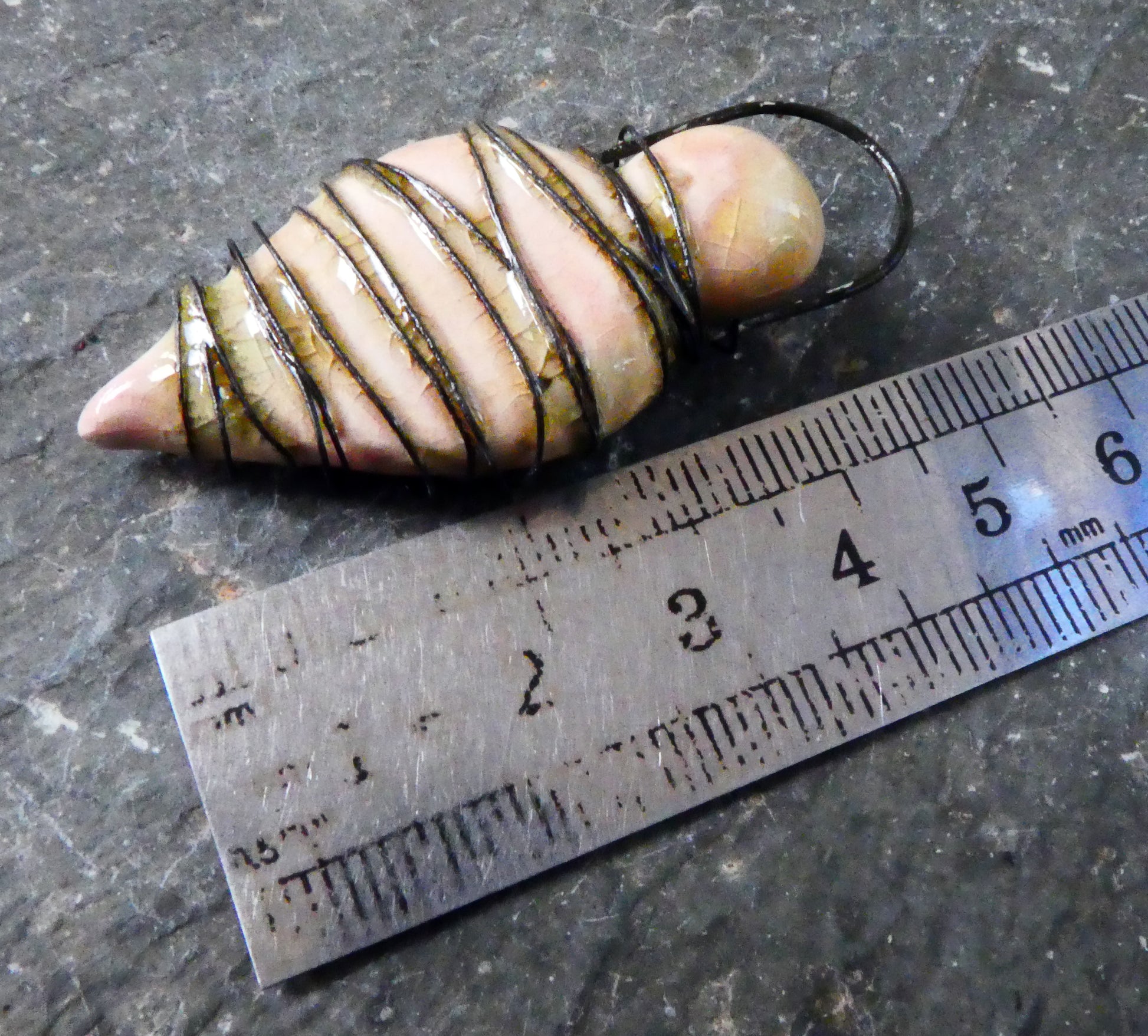 Hand formed in Earthstone and high fired with fine wire.. Then fired again with Orchid glaze. 50mms, and lightweight.