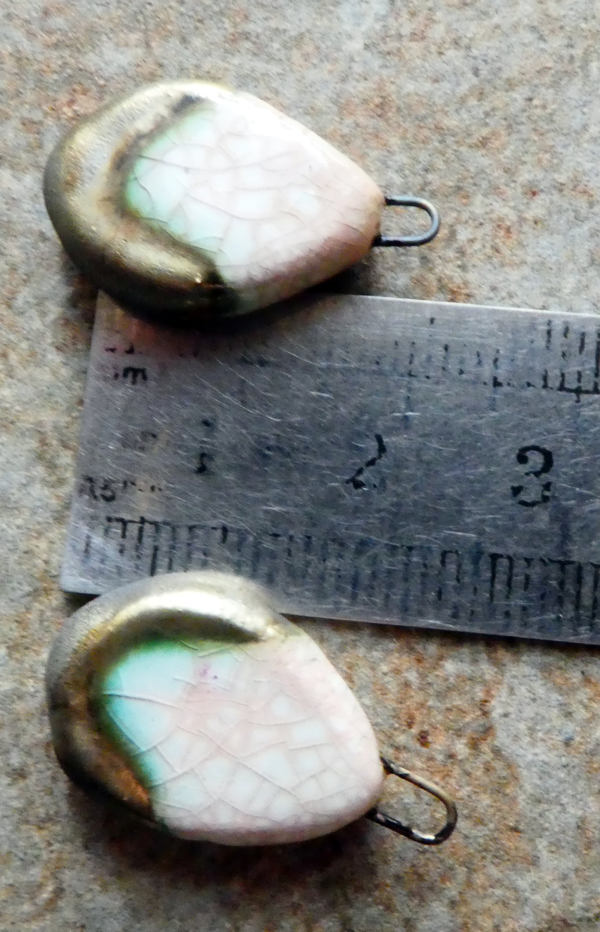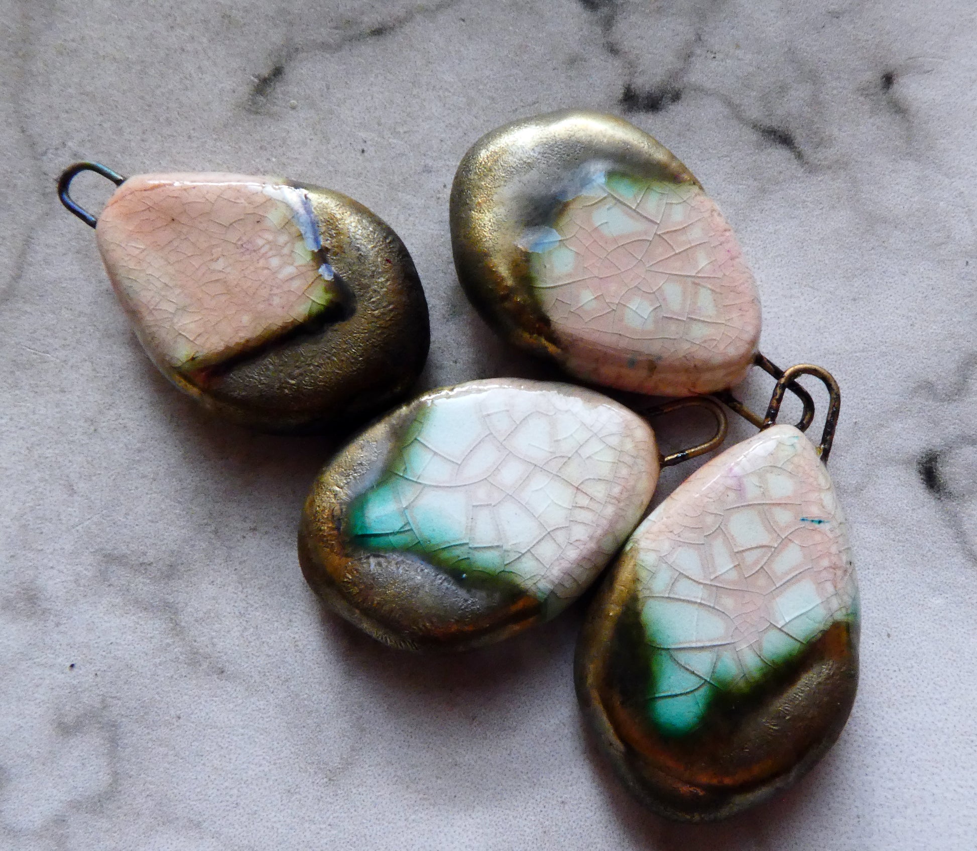 Hand formed in Porcelain and high fired. Glazed with Transparent Crackle, and dipped in Bronze, then fired again. After firing, I dipped them in Pale Orange alcohol ink, so that it soaked into the crackles. Then wiped them back, to leave defined, cobwebby crackle patterns.