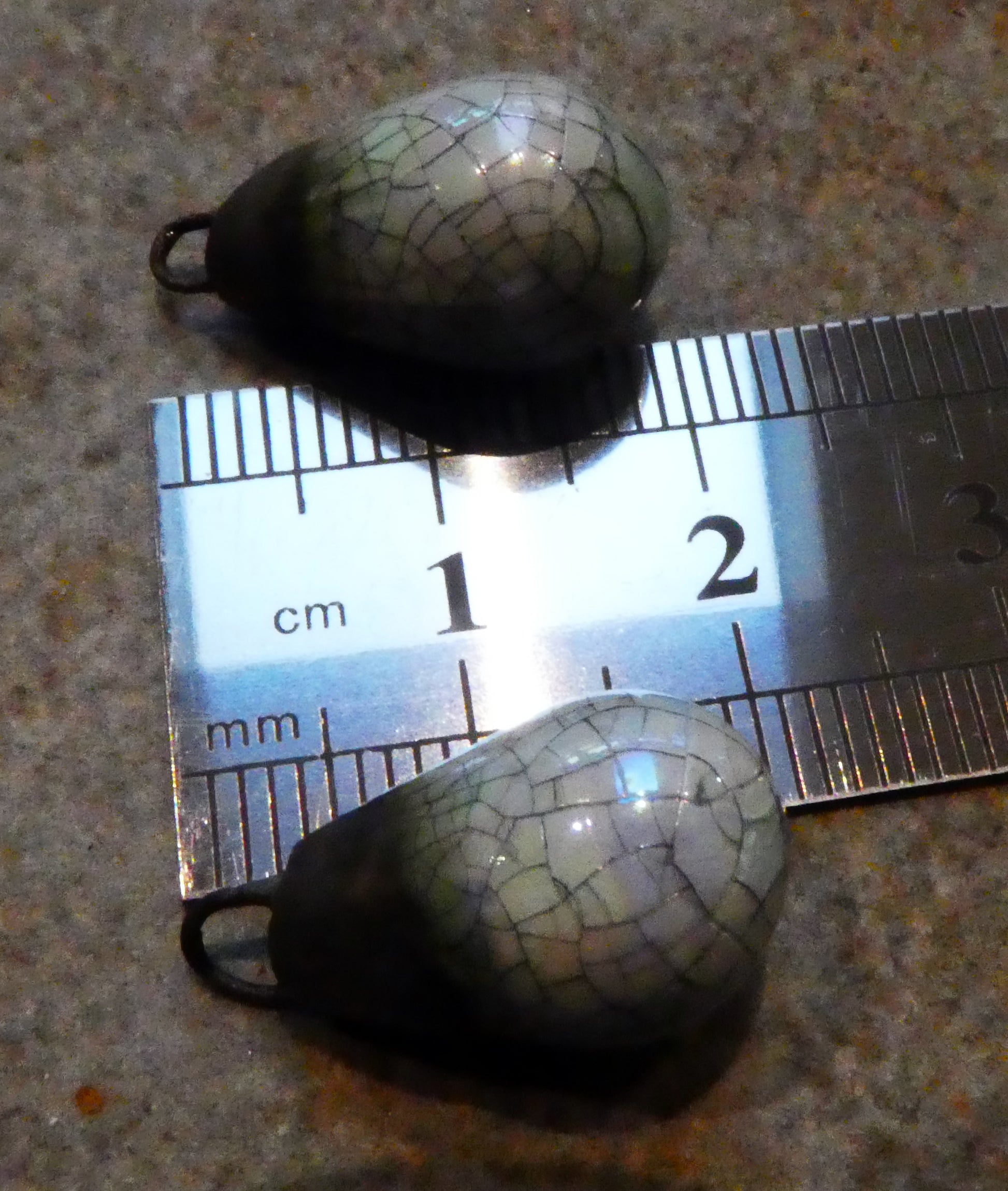 A pair of porcelain drops earring charms on hoops. Hand formed, snowy-white Southern Ice porcelain, glazed with Crackle, and dipped in Bronze, then fired. Applied with Mother of Pearl Lustre, and fired again.After firing, I dipped them in Indian ink, so that it soaked into the crackles. Then wiped them back, to leave defined, cobwebby crackle patterns. All slightly different, but on average 20mms, and very lightweight. ©ScorchedEarthDesigns