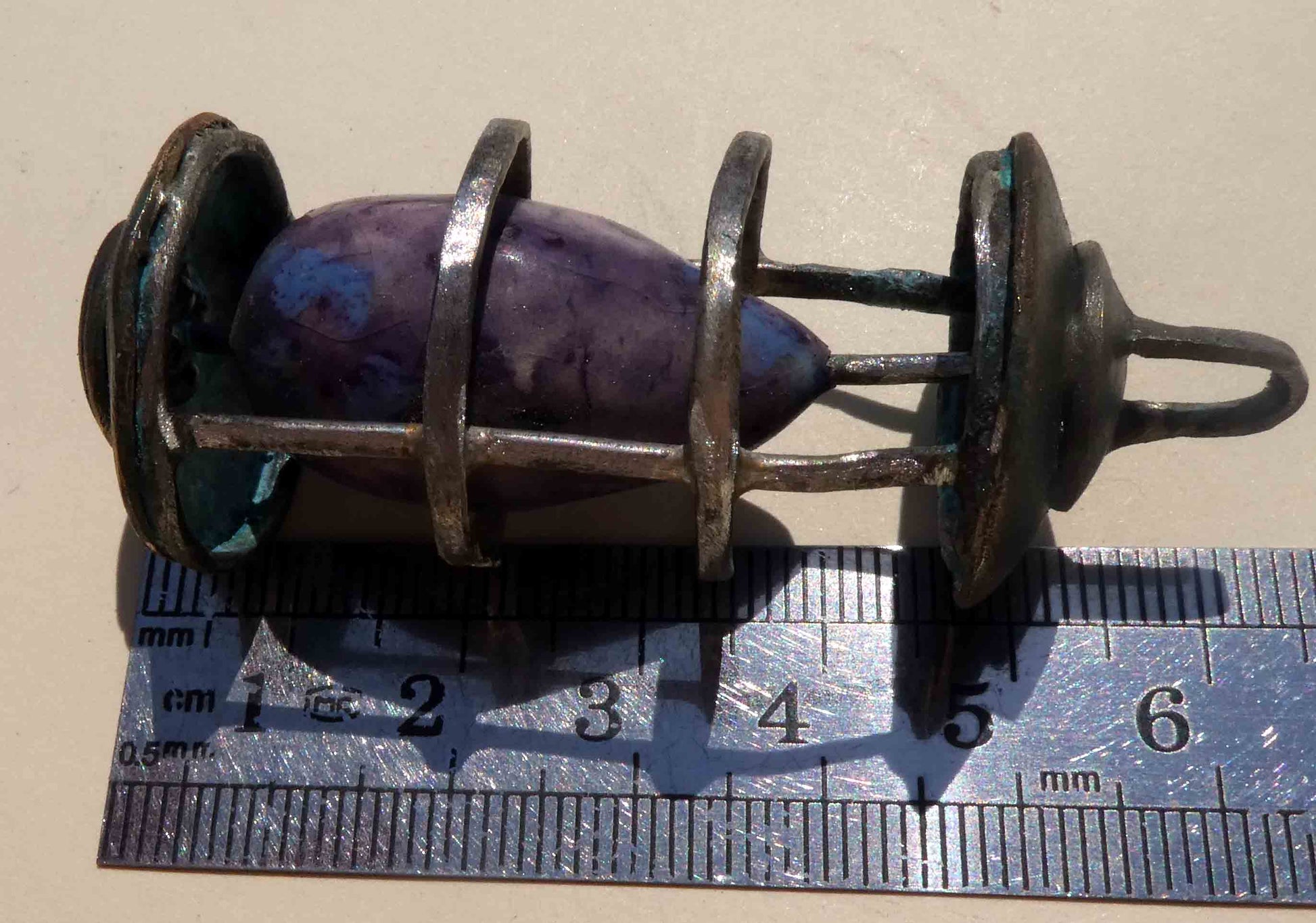 Hand forged in Steel wire, silver soldered (with great difficulty, may I add!!!). The top and bottom are forged from domed and soldered discs of Guilting Metal, that I have layered with green and blue patina to age it. With a ceramic 'stone' enclosed, glazed with Grape Splash.