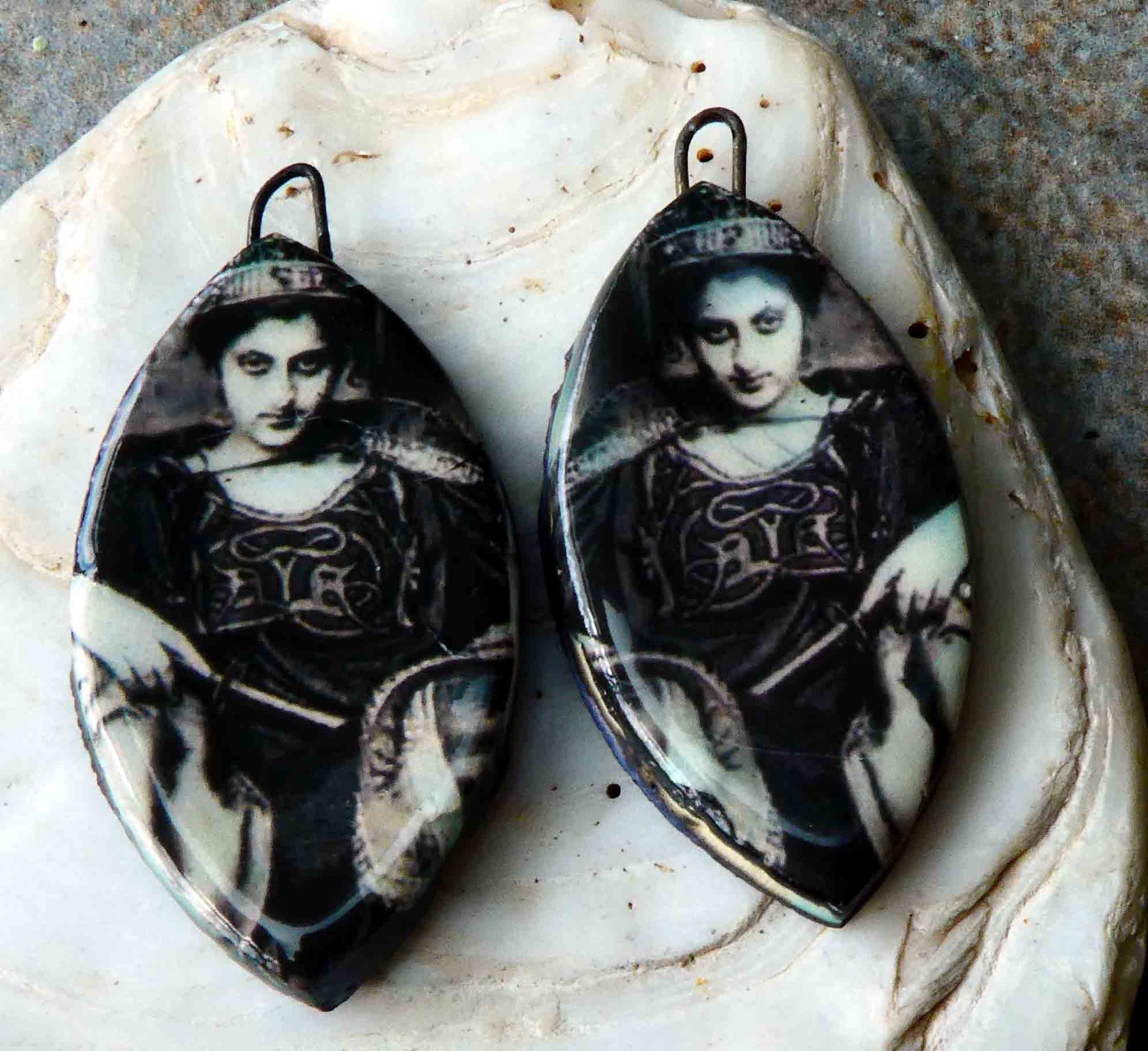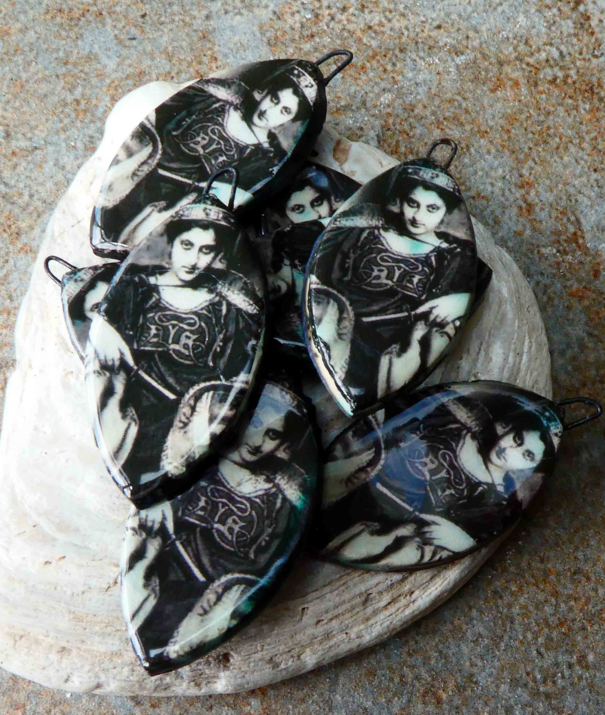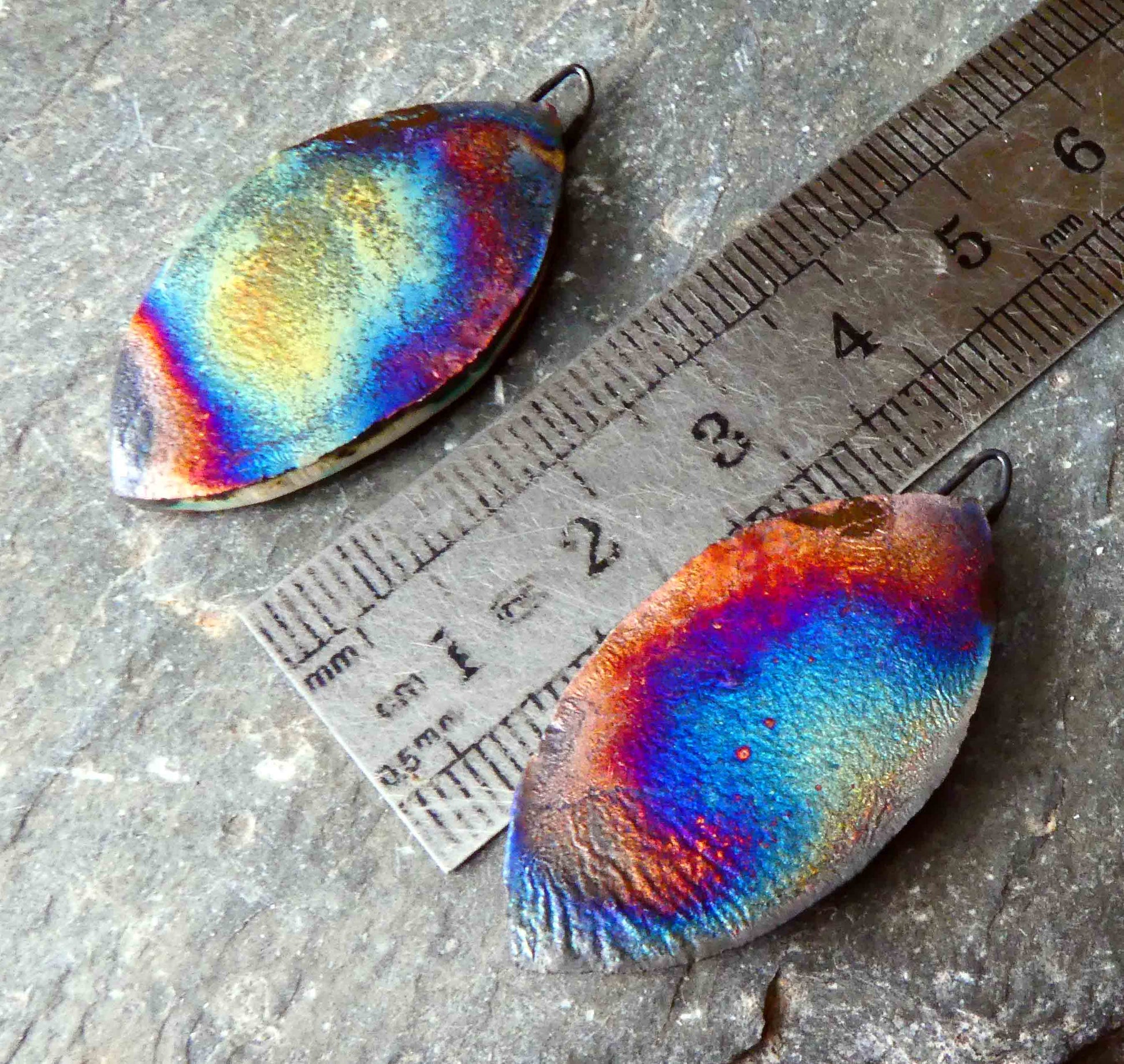 Hand formed in Earthstone and high fired. Then fired again with bronze clay and gloss glaze. Applied with decals and Platinum lustre and fired again. Scorched on the backs to a rainbow finish. 40mms and very lightweight.