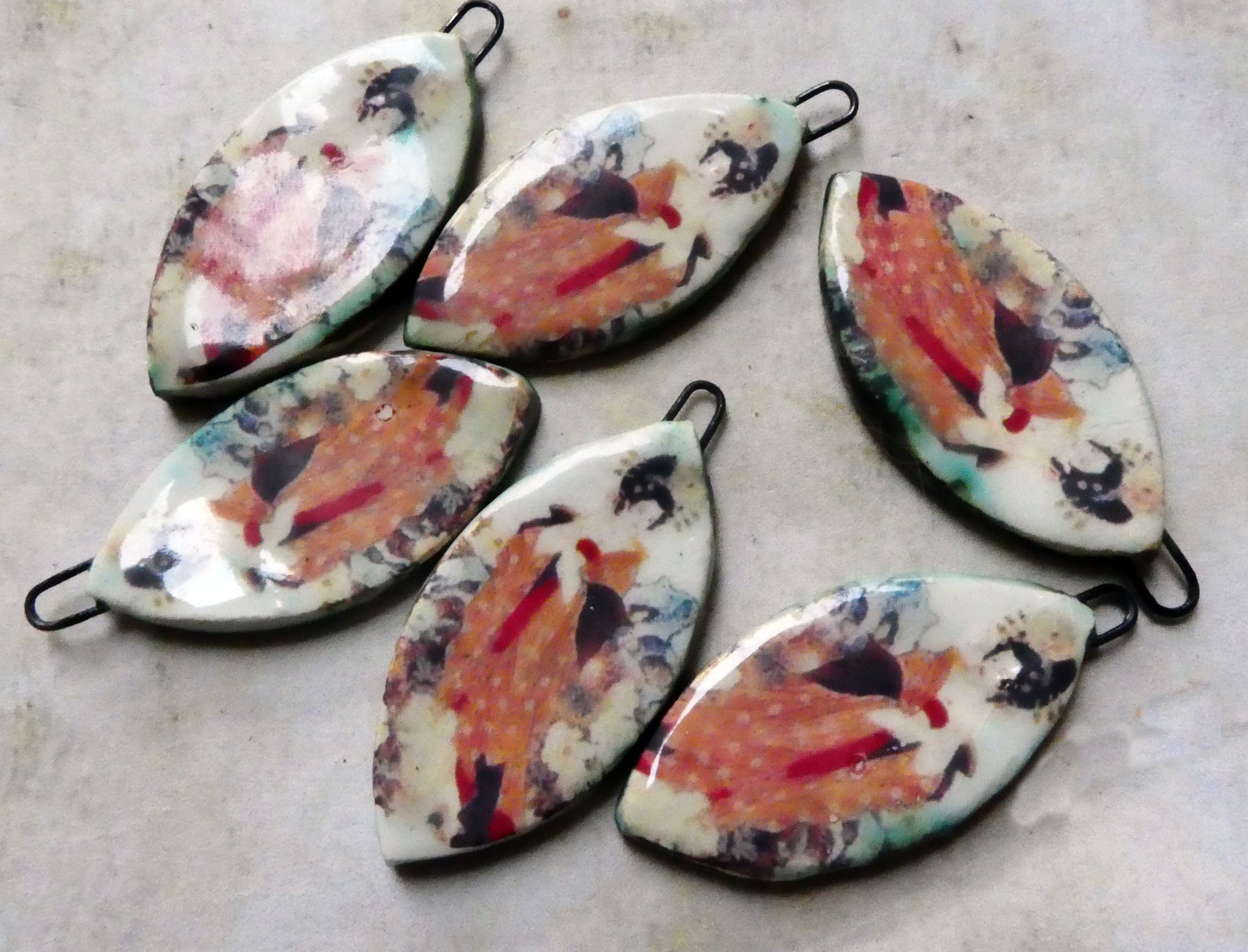 A pair of lightweight feminine charms. Hand formed, drops in Earthstone, high fired. Then fired again with glossy glaze and bronze clay. Applied with beautiful matching Chinese print ceramic decals, depicting one of the Four Great Beauties, Yang Guifei then fired again. Scorched on the backs to a rainbow finish.