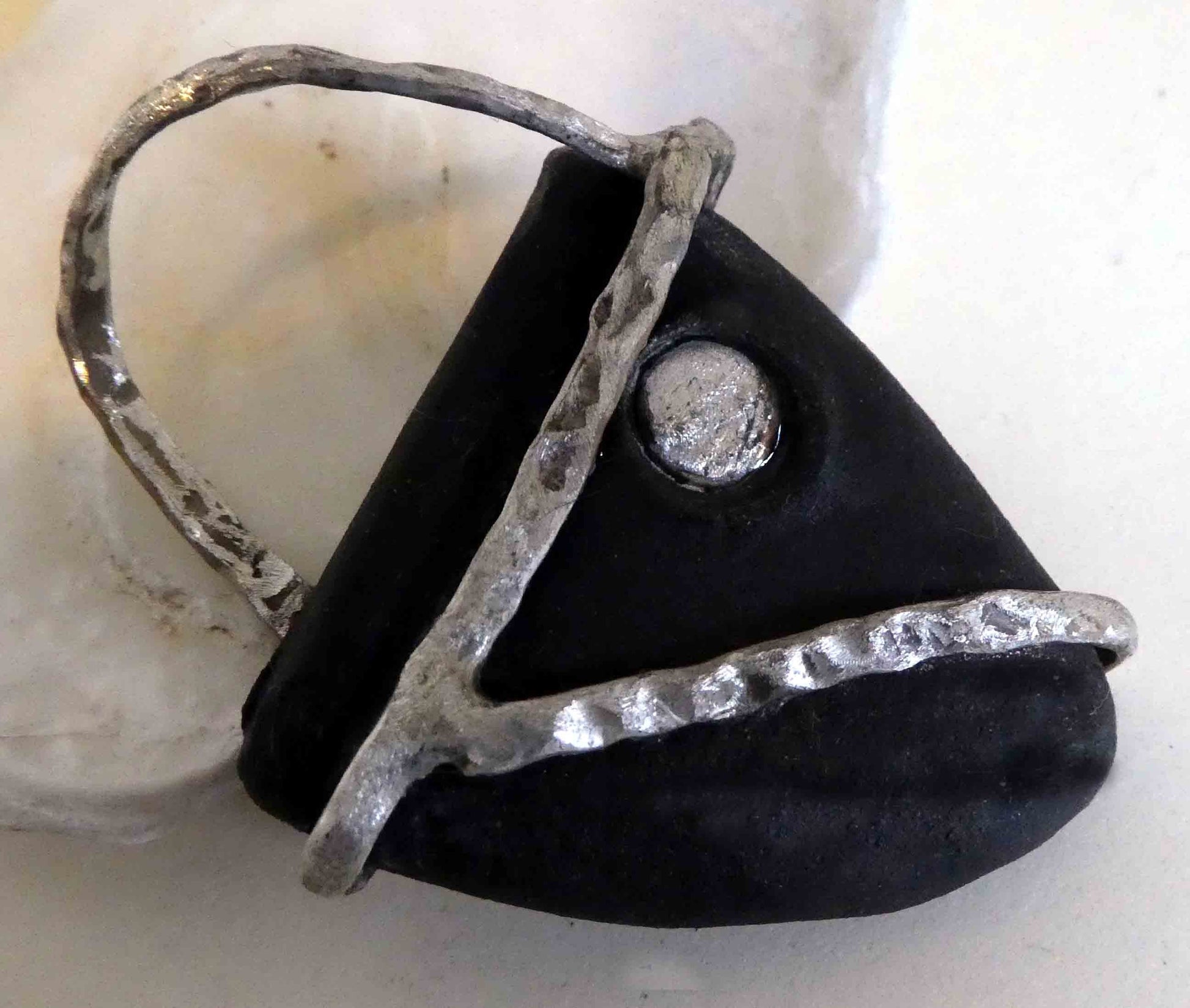 A black and silver unisex pendant. Hand formed nugget in Black Stoneware, high fired. Then fired again with a solid .999 Fine silver nugget. Caged in hammered Sterling Silver. ©ScorchedEarthDesigns