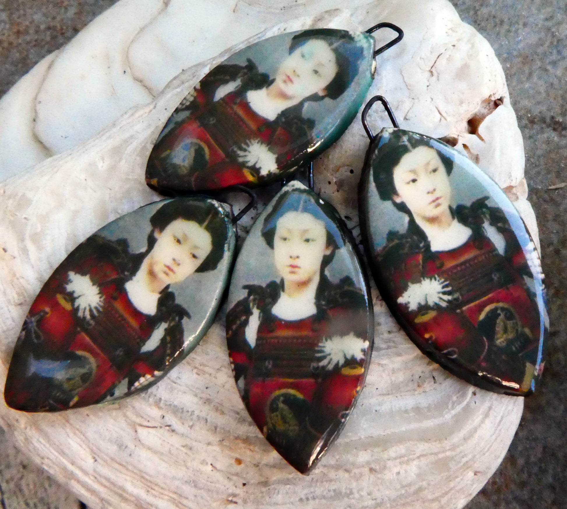 Hand formed in Earthstone and high fired. Then fired again with bronze clay and gloss glaze. Applied with Onna-Bugeisha Warrior decals and Platinum lustre and fired again. Scorched on the backs to a rainbow finish. 40mms and very lightweight.