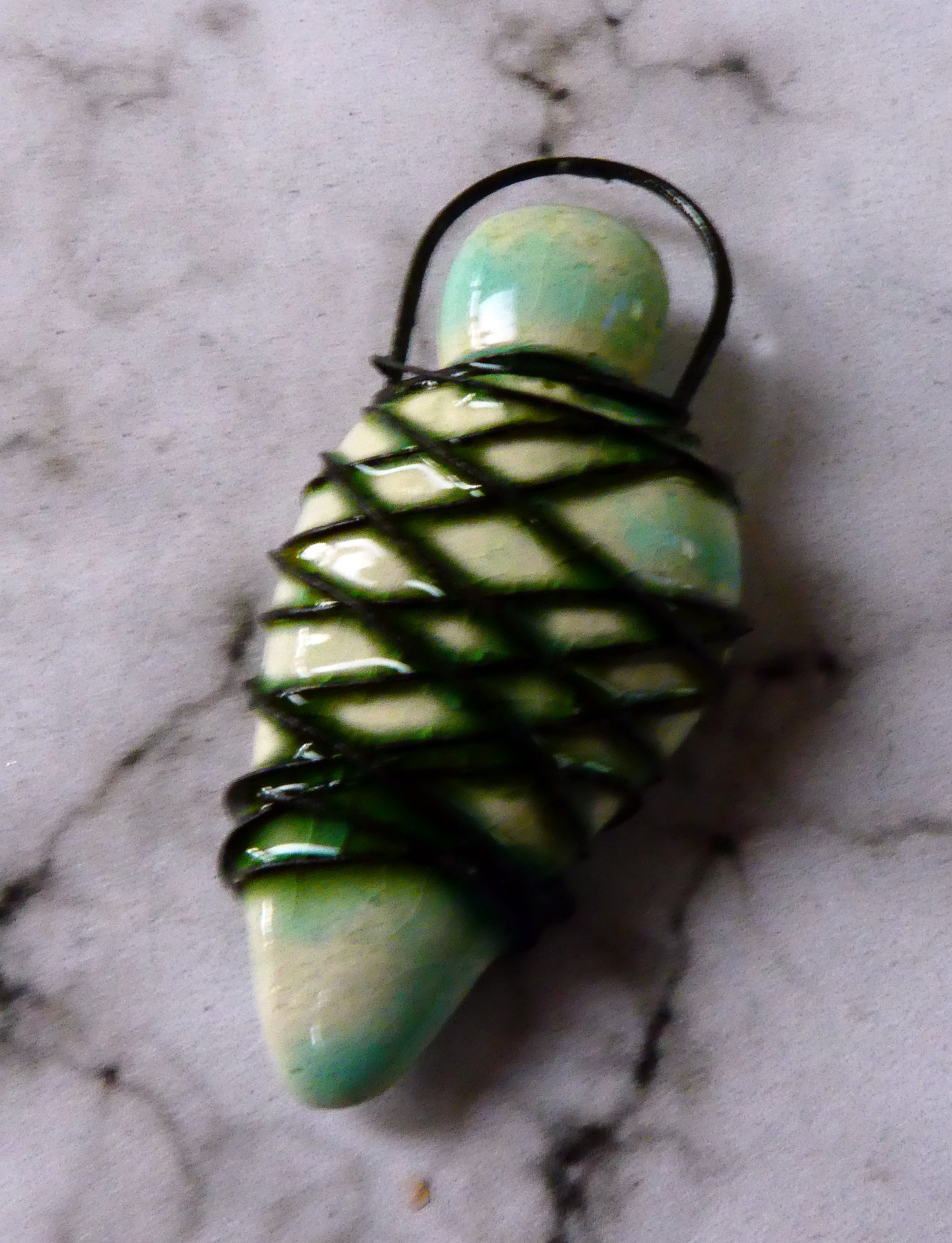 Hand formed in Earthstone and high fired with fine wire.. Then fired again with Turquoise Crackle glaze. 50mms, and lightweight.